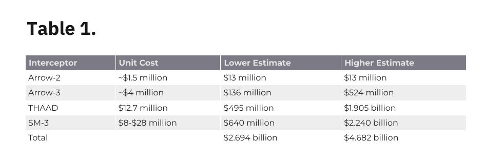 There are a few ways to add this up. Using only the interceptors verified in Abbadi’s videos, the cost was $644.5 million. Raising the number of THAAD interceptors to 150 brings the cost to $2.054 billion. Adding SM-3s introduces variance but brings the total to between $2.694 billion and $4.294 billion. Finally, shifting to the high, but lowconfidence estimate of Arrow-3 expenditure