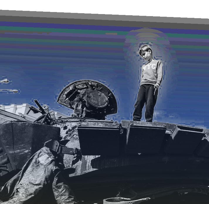 A boy stands on the remains of a burnt Russian tank, once installed as an exhibit, Kyiv, May 25, 2022. (Serhii Korovainyi/war.ukraine.ua)