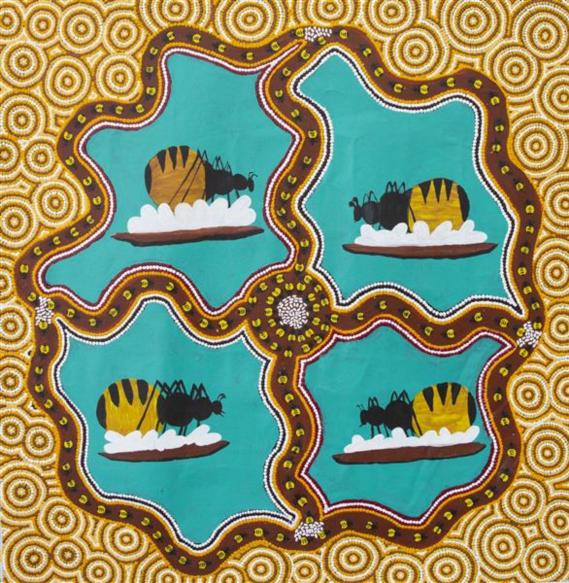 (Dreaming) narratives, using distinct features or colours from the associated landscape to orient each narrative in space. Charles also uses her painting practice to share cultural knowledge, ensuring the continued safe passage of skills and practices which are as important in contemporary living as they have been many years hundreds of years.