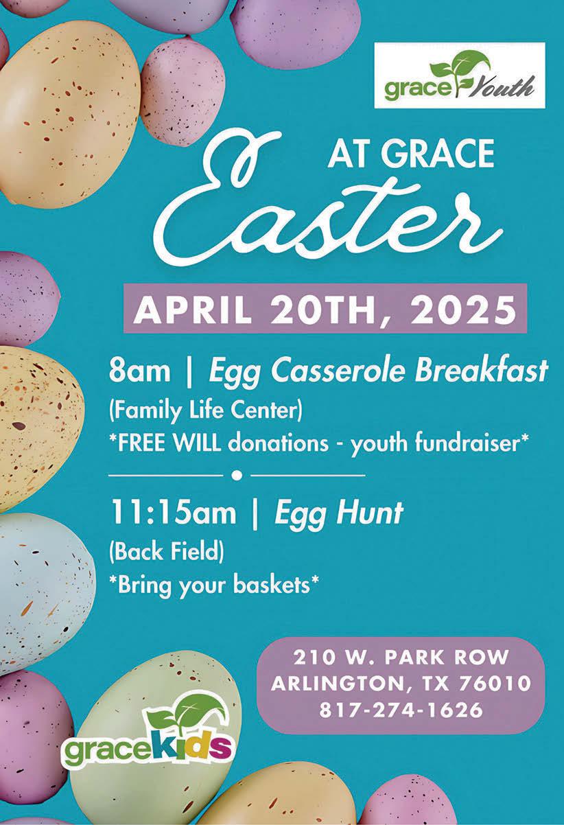 Christ Chapel Bible Church (3701 Birchman Av, Fort Worth) takes RSVPs for their Easter weekend services to ensure there is room for everyone. Choices still available include 3pm and 6pm Sat, Apr 19, and 7:30am Sun, Apr 20. To RSVP and check out dates and times for the West Campus (3910 E I-20 Frontage Rd, Willow Park) or South Campus (390 N Burleson Rd, Burleson), visit My.CCBCFamily.org/ EasterRSVP. (Note: Kids Ministry is offered for children in 4th grade and below during all Easter services, except for the 7:30am service.) listings continued on page 22