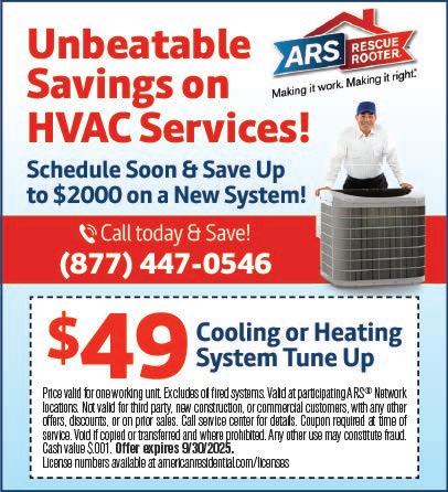 As temps outside start to climb, the season for savings is now. $49 cooling or heating system tune up. Save up to $2000 on a new heating and cooling system (restrictions apply.) FREE estimates. Many payment options available. Licensed and insured professionals. Call 1-877-447-0546 today. (MB)