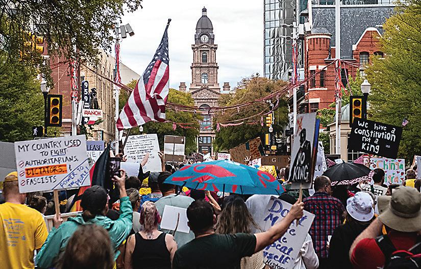 Through rain and shine, Fort Worthians filled Burk Burnett Park yesterday for the city’s second No Kings protest of the year. Organizers with the progressive group Indivisible 12 estimated between 7,000 and 8,000 attendees, the largest protest in Fort Worth’s history. The rally was part of similar rallies across the country. Estimates indicate that nearly 7 million