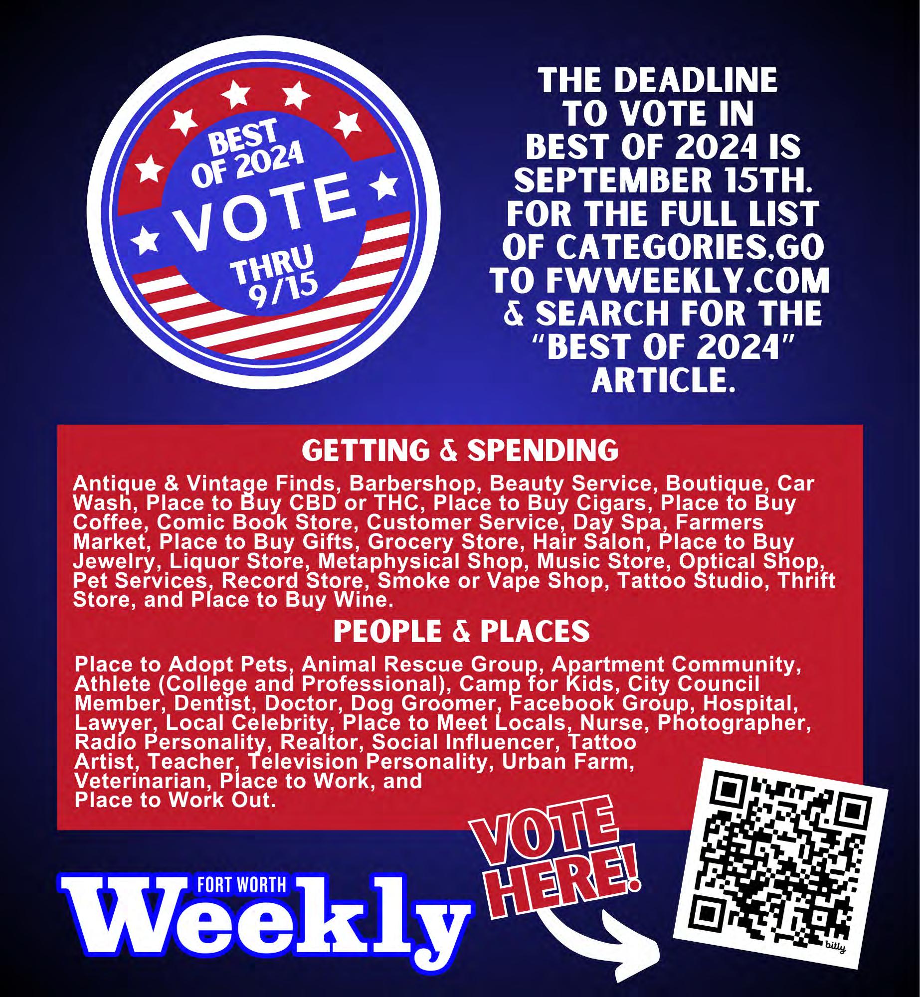 The ballot for the Readers’ Choice portion of our annual Best-Of Awards is now open. As it’s limited to one ballot per person, you can make an impact by voting by Sunday, September 14. Read all about it here: Bit.ly/AboutFWWBestOf2024