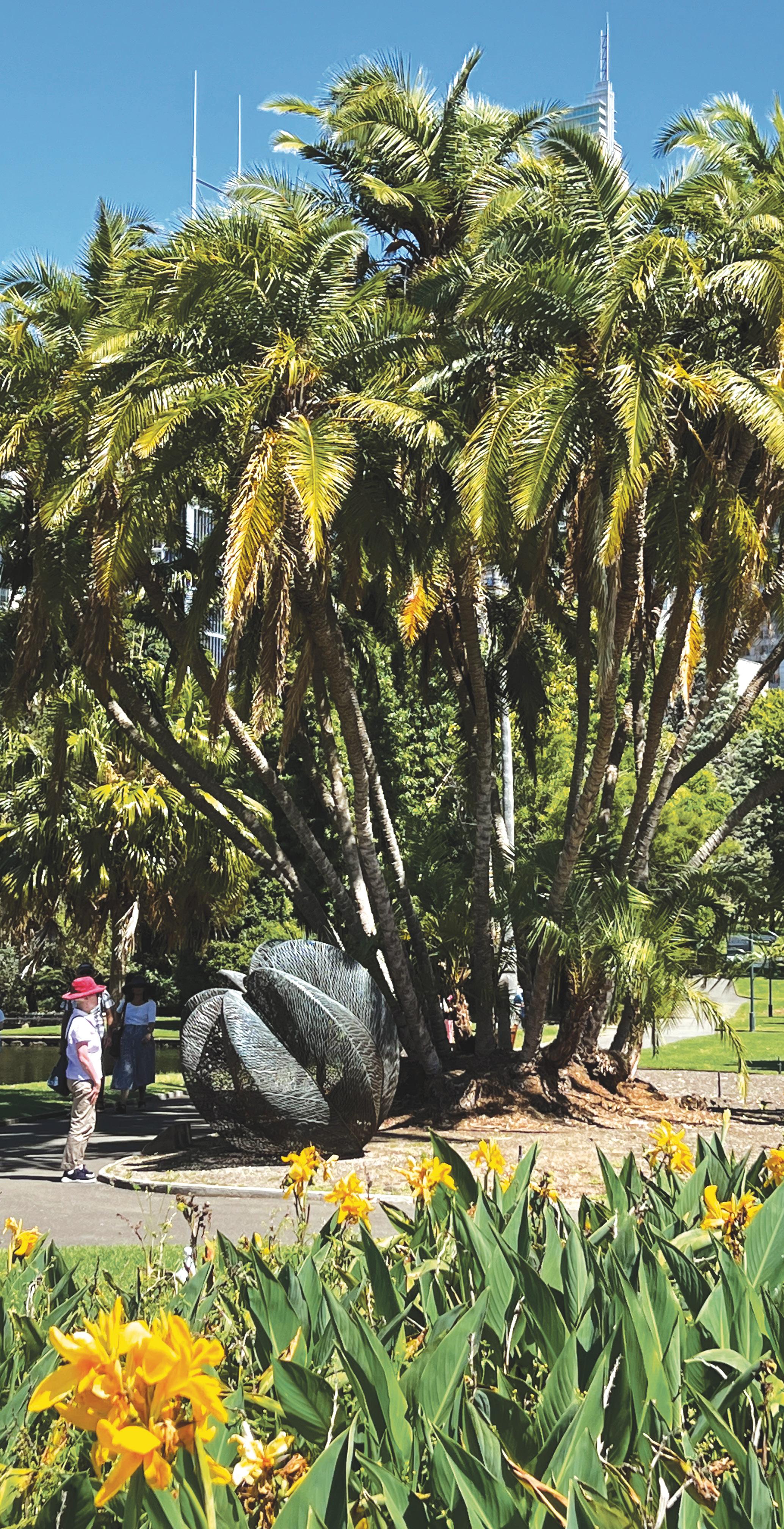 A fine copper sculpture by the late Australian sculptor Bronwyn Oliver sits beside our Phoenix reclinata. Entitled “Palm” (1999), it echoes the plant’s folded fronds.