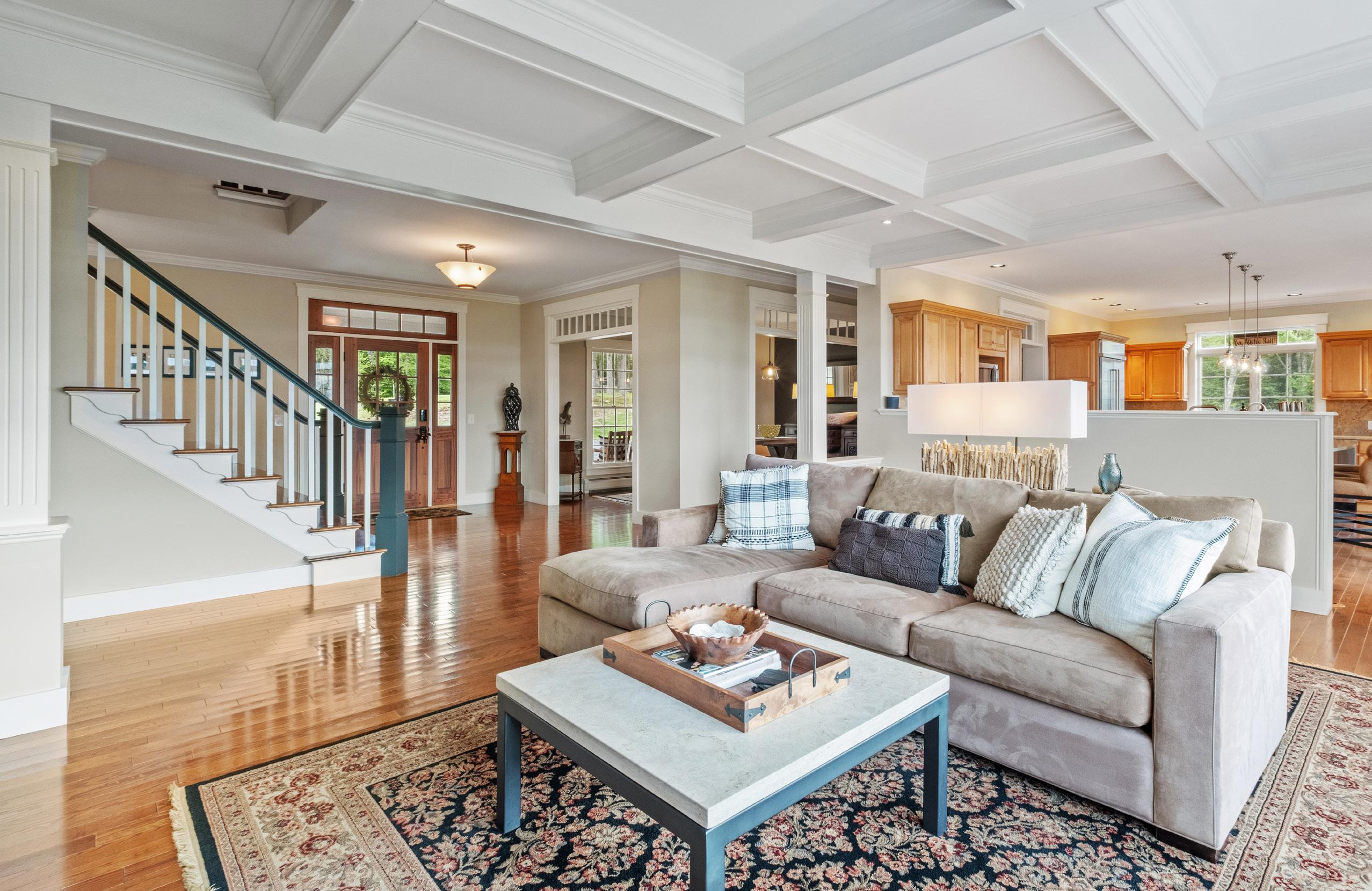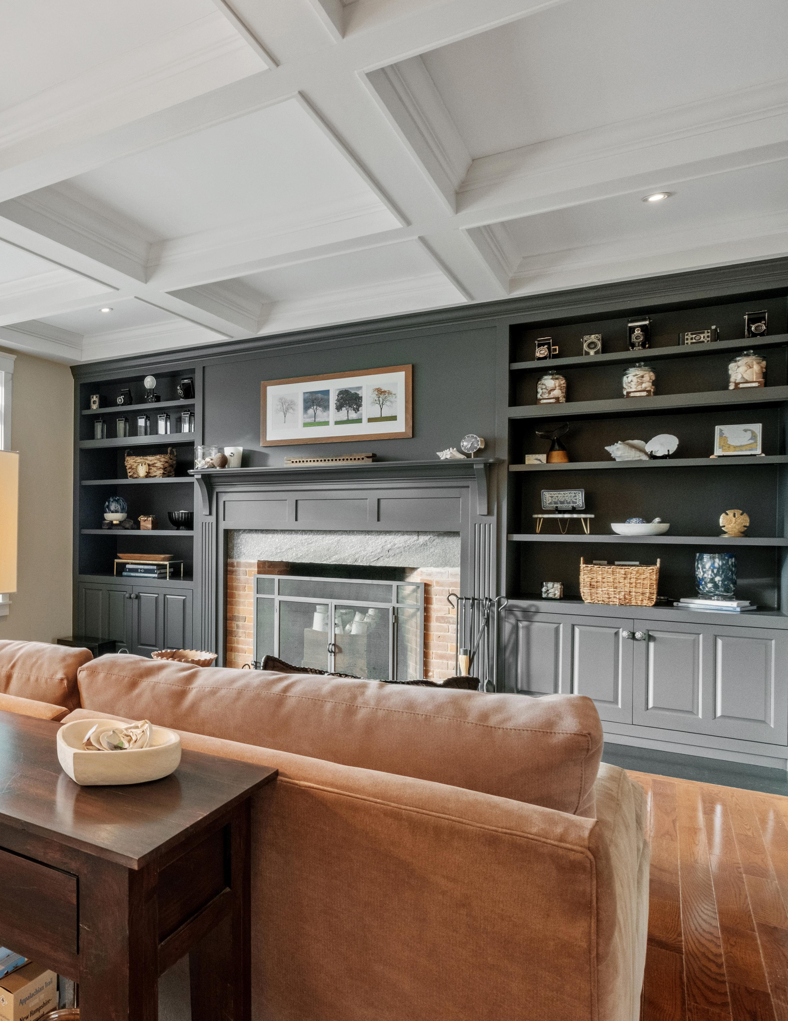 • Living Room: Soaring coffered ceilings, expansive windows, and a fireplace
