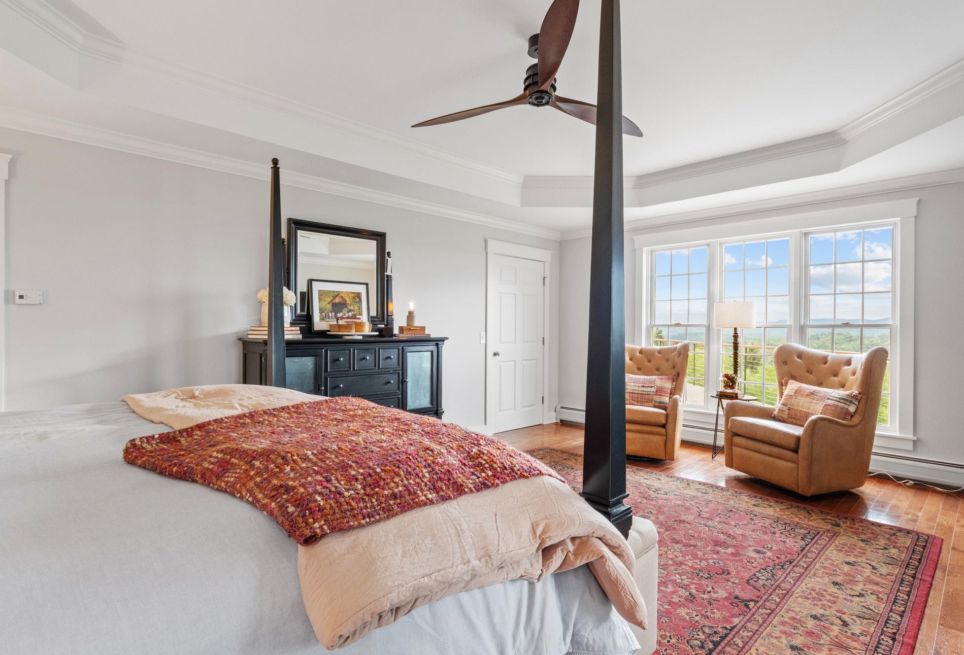 This meticulously maintained five-bedroom, four-anda-half-bath home offers sweeping views of the Connecticut River Valley and New Hampshire mountains. Designed for comfort and flexibility, it features an open-concept layout with main-level living, hardwood floors, tall ceilings, and expansive windows that fill the space with natural light. The gourmet kitchen includes granite countertops, highend cabinetry, a built-in refrigerator, wine fridge, and a large island with prep sink. Cozy up by the fireplaces in the living room or den, and enjoy the freshly painted, airy interiors throughout.