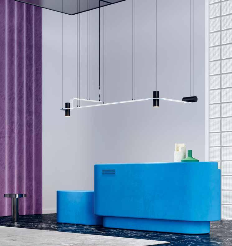 Rectangular sections and curved elements come together in the NASTRO lighting collection by Studiopepe for TOOY. Suspended and wall compositions with endless configurations are possible with the architectural lighting system, which has a dimmable LED light source. tooy.it