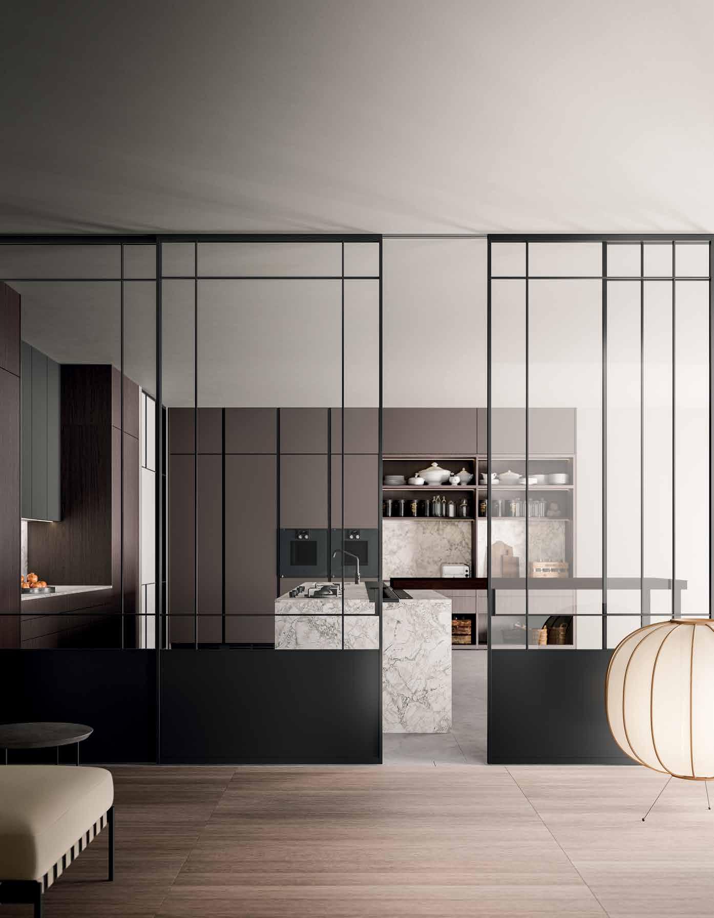 The GOLDEN GATE door system is composed of two parts: a glass pane with diagonal slats and a fabric panel. Designed by Mikal Harrsen for ADL DESIGN, the door is available in a variety of configurations, maintaining conviviality between separate rooms and allowing for effortless spatial transformation to accommodate new functions. adldesign.it