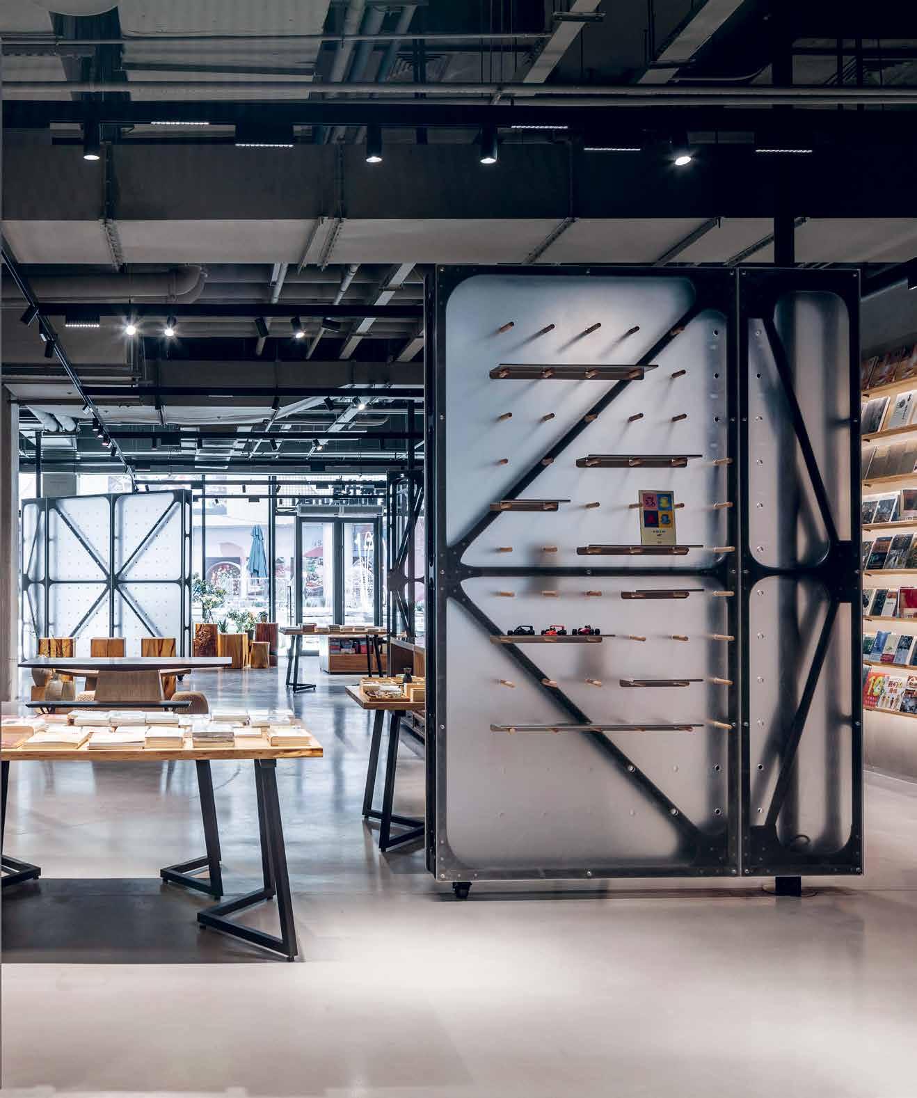 Thanks to a bespoke and flexible shelving system, the Mumokuteki Concept Bookstore can transform to host exhibitions and events. Rotating screen walls, inserted under the beams and constantly moveable, add to the dynamic setting.