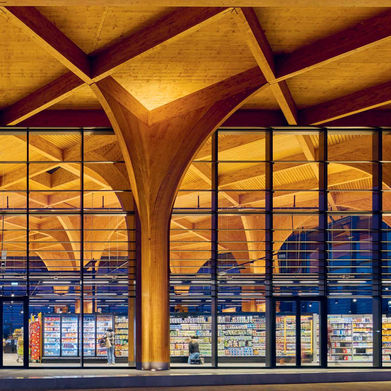 Large open spaces with 9-m-high ceilings make flexible layouts and alternative future uses possible at SuperHub Meerstad in the Netherlands. Designed by De Zwarte Hond as a social meeting space for locals, the supermarket – which includes a café – can be continuously rearranged to fit changing functions, like hosting events. In the future, the building can be repurposed into anything from a museum to a residential block.