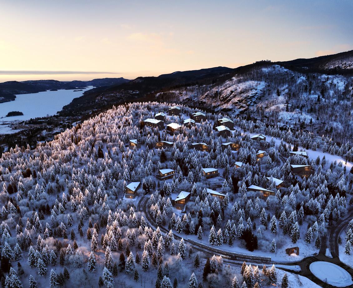 Reprenant certains traits caractéristiques de l’architecture de montagne, l’ensemble emploie le langage de la nature. Avec leur toit en pente, leur revêtement de bois et de pierre, leur intégration au relief (volume et voie d’accès), les différents types d’habitations se marient au décor, s’imbriquent à la forêt, s’unissent à la montagne. Plus encore, chaque terrain détenant une topographie différente, chaque bâtiment s’y adapte par un positionnement étudié visant à procurer aux usagers des vues spectaculaires, un ensoleillement généreux, des espaces de vie ouverts et vastes… Tout est conçu pour laisser une place prédominante à la nature qui enveloppe alors chaque espace, préservant l’intimité et la tranquillité de ses occupants.