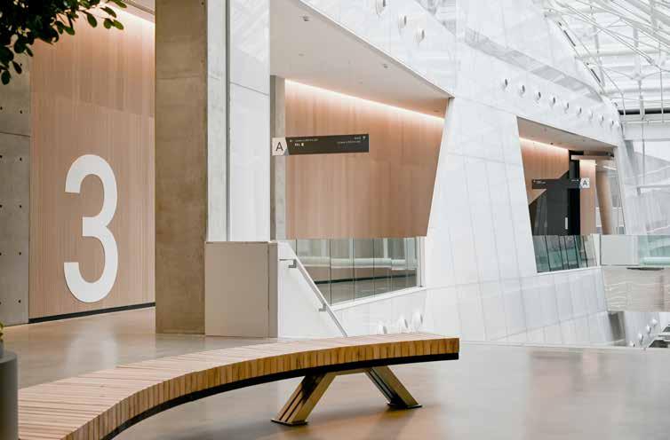 Des répertoires de niveaux juxtaposés aux ascenseurs jusqu’à l’identification des salles, en passant par les directionnels suspendus dans les couloirs, l’information est transmise à relais pour guider l’usager, en tenant compte des meilleures pratiques en matière d’accessibilité universelle. Des écrans dynamiques permettent en outre d’animer le parcours et de fournir d’autres informations de manière visuelle.