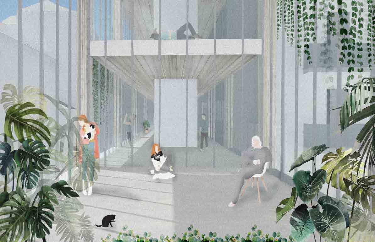 L’area di progetto è situata in un quartiere residenziale torinese precisamente il quartiere di Santa Rita. Il lotto scelto e su cui creare un nuovo scenario è un lotto appartenente alle ATC meglio conosciute come “case popolari”. Lo scenario che si propone non si limita ad un nuovo modo di abitare, ma include l’aspetto del lavoro in modo preponderante. Immaginiamo che in questa nuova realtà il lavoro stesso crei un polo attrattivo, nello specifico per particolari soggetti che necessitano di essere reintrodotti all’interno della società, al punto tale che l’abitare diventi una necessità subordinata al lavoro. Alla luce di queste considerazioni e dello studio sulle condizioni attuali dei due edifici, si è sviluppato un progetto che mira alla risoluzione di alcuni aspetti problematici, attraverso quattro interventi principali: la distribuzione, lo spazio aperto, la trasformazione delle residenze e l’introduzione dei laboratori. Per migliorare la distribuzione è stato necessario introdurre degli ascensori in nuovo volume . L’accesso alle residenze, in questo modo, avviene da un ballatoio che si estende a partire dal nuovo volume e che circonda tutto il perimetro interno degli edifici. Lo stesso ballatoio, in alcuni casi, entra all’interno dell’edificio sottraendo dello spazio alle abitazioni e trasformandolo in giardini d’inverno o in uno spazio di ingresso più ampio, condiviso da due alloggi antistanti. Si è deciso di arricchire l’ intervento destinando alcune parti del volume, sia ad un piano che a doppia altezza, a funzioni per favorire l’aggregazione, in modo da rendere questo spazio vivo e non unicamente utilizzato a scopo distributivo. Infine, si è deciso di integrare la vegetazione all’interno del progetto. Data l’assenza di alberature e spazi vegetali allo stato attuale, e data l’importanza che questi assumono all’interno del quartiere, abbiamo ritenuto fondamentale integrare la vegetazione portandola in altezza. Gli spazi di lavoro sono stati pensati come luoghi luminosi e a doppia altezza così da creare un realtà economica indipendente all’interno dello stesso lotto. Il fine dei laboratori è quello di dare una possibilità agli individui bisognosi di avere un riscatto sociale. Sono stati pensati spazi versatili che si possano adattare con facilità a diversi tipi di lavorazioni e attività. Sono previsti ampi spazi in cui poter effettivamente compiere le lavorazioni e spazi più contenuti che potrebbero ospitare start-up o altre tipologie di attività. Nel residenziale si è optato per due tipi di appartamenti : temporanei e a lunga durata
