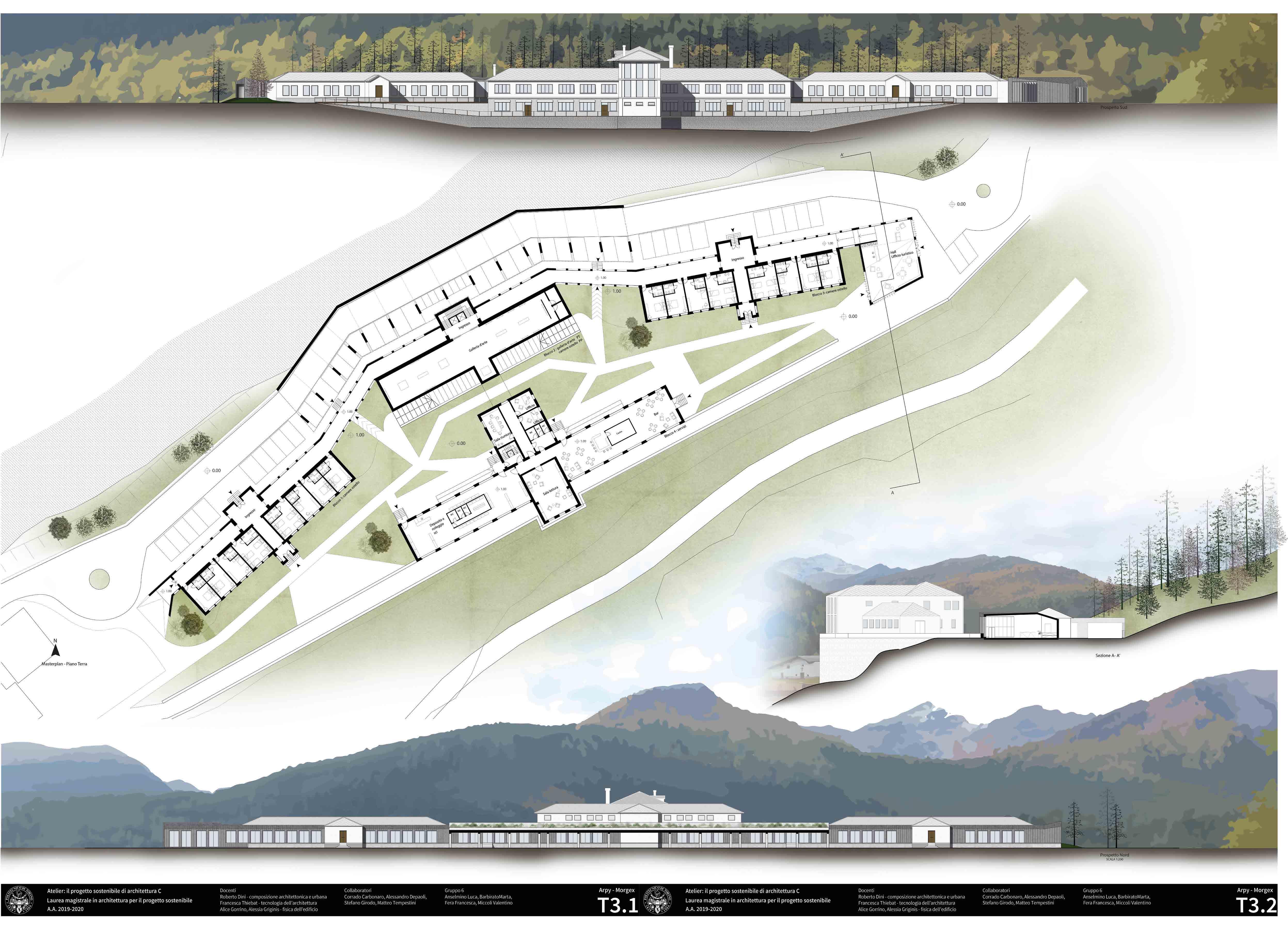 L’elemento protagonista del progetto è la montagna, non solo come sfondo ma come punto centrale e di riferimento per la maggior parte delle scelte progettuali. Analizzando l’area si è percepita subito la vocazione di Arpy: un ostello completamente immenso nella natura con grandi potenzialità di sviluppo sotto l’aspetto sportivo ma anche artistico, dettato dall’isolamento dell’area e al senso di pace e benessere che essa ti trasmette. Trattandosi di un’area, ad oggi, poco utilizzata e non pienamente sfruttata, attraverso alcune analisi si è cercato di individuarne criticità e punti di forza. L’isolamento, che all’inizio pareva essere una debolezza del progetto, si è rivelato un ottimo punto a favore. Così si è arrivati a pensare al nuovo ostello come un punto di raccordo non solo per lo sport ma anche per possibili attività riguardanti l’arte, creando all’interno delle preesistenze degli spazi adibiti a tali attività. La zona è situata in una area strategica che si trova a pochi minuti di distanza dai principali poli della Valdigne, dando cosi la possibilità di poter partecipare a diverse attività sportive sia nel periodo estivo che invernale. Un importante problema da risolvere è stato quello distributivo, sia per quanto riguarda gli spazi comuni esterni sia per gli interni. Per via della forma del lotto e per la mancanza di un parcheggio limitrofo all’area, tra gli edifici esistenti si andava a creare uno spazio a cui veniva permesso l’accesso anche alle vetture. Per garantire più apertura e maggiore utilizzo delle zone centrali, si è spostata la viabilità nella zona retrostante, andando ad inserire una galleria che entra parzialmente nella montagna e permette alle vetture di costeggiare tutta l’area. A questa galleria è stato affiancato un corridoio pedonale al fine di mettere in comunicazione i tre edifici retrostanti: spostando l’elemento di distribuzione all’esterno si è ricavato più spazio negli edifici esistenti per poter aumentare la metratura delle camere dell’ostello. Per poter dare un’immagine più uniforme del complesso è stato aggiunto un nuovo volume che fungesse da ingresso all’ostello e alla nuova area riqualificata. Per rispettare la preesistenza questo nuovo volume si inserisce in maniera armonica con il contesto, rispettando le altezze degli edifici limitrofi e rispettando uno schema assiale particolare che lo mette in comunicazione con il disegno del suolo. La posizione strategica di questo edificio, permette al visitatore di avere uno sguardo diretto sul meraviglioso panorama circostante, proprio per questa ragione sono state inserite grandi vetrate a tutta altezza, per accentuare ancora di più questo aspetto. Questo doveva essere un elemento di contrasto con l’esistente soprattutto sul piano energetico e tecnologico, ovvero meno impattante sul piano energetico e con materiali il più sostenibili possibile. Ecco perchè le nostre scelte sono ricadute su una struttura portante in acciaio alla quale vengono poi fissati i montanti e i traversi in legno che sono la struttura portante delle pareti di tamponamento, costituite per lo più da isolante e pannelli OSB. Mentre il rivestimento esterno in lamiera zincata vuole essere sostenibile ma anche rilevante esteticamente rispetto al costruito esistente.