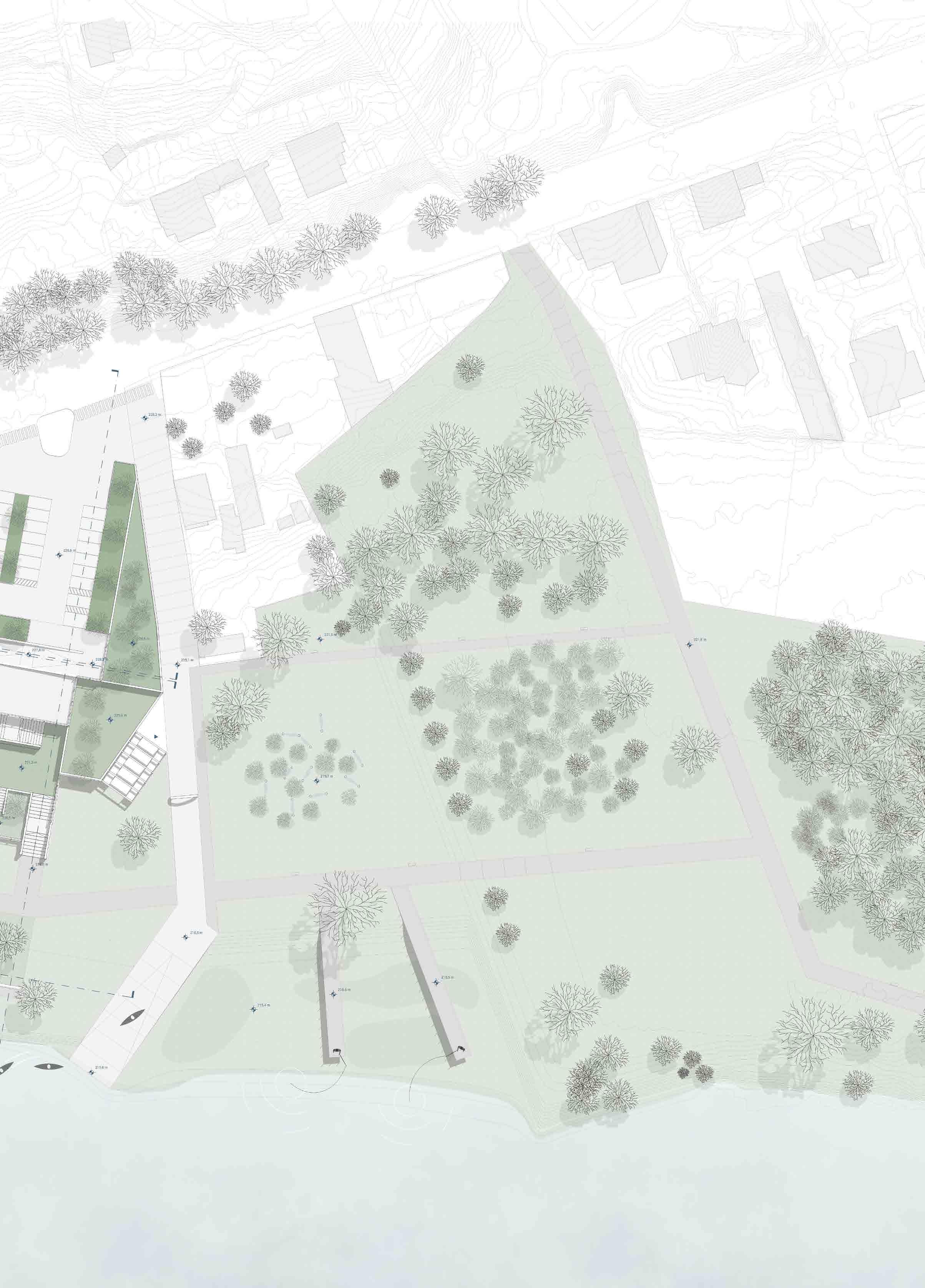 Allo stato di fatto quest’area ha una vocazione naturalistica e sportiva , in quanto vi era il Circolo remiero, ma con un aspetto compositivo abbastanza frammentato. Dall’analisi diacronica fotografica dell’area emerge come il rapporto con il fiume non sia solo un rapporto di reciprocità visiva, ma è un rapporto intrinseco proprio nella loro formazione, in quanto precedentemente al ’57 tutta quest’area specialmente il lungo fiume non esisteva, e solo successivamente con il ristringimento del letto del fiume, si è arrivati alla conformazione di un pianalto artificiale e quindi ad una morfologia molto esasperata. L’intento del progetto quindi è quello di progettare delle nuove funzioni all’interno dell’area che ne permettono il suo sviluppo, ma tenendo conto di un impianto unitario che vada a negare la frammentazione che adesso esiste. Gli elementi di resistenza del progetto sono la passerella e la necessità di ridefinirne un nuovo approdo, l’accesso al lungo fiume e la volontà di valorizzare l’arco come soglia di accesso, ruolo che ha sempre avuto nella storia e l’integrazione di spazi a servizio del trasporto pubblico e privato in rapporto con corso Moncalieri. L’intento progettuale si definisce come una volontà di rimodellare interamente e tridimensionalmente la morfologia dell’area partendo dal presupposto che la morfologia stessa dell’area sia di per se già artificiale. Il cretto architettonicamente parlando diventa la matrice che da unitarietà ai diversi aspetti del progetto, rafforzato da un’impostazione modulare basata su una griglia che ha come assi e come modulo l’elemento della passerella. Il pianalto viene riformulato come sottrazione e addizione di volumi di terra, contenuti dal costruito, mentre la parte di lungo fiume seppure influenzata della metodologia del cretto resta più naturale. L’assetto compositivo messo in atto prevede un’analisi architettonica mult-scalare, nell’ottica di unitarietà infatti non esiste un elemento specifico che non influenzi il generale. La conformazione del pianalto si struttura architettonicamente a seguito dell’inserimento degli edifici semi interrati , ed è composta da un podio sovrastato dai vari oggetti architettonici con la loro funzione. Osservando l’area dal punto di vista del fiume l’elemento predominante visivamente è la colonna . La colonna è elemento di snellezza del fronte lungo fiume, elemento strutturale dell’architettura, elemento che descrive la modularità dell’impianto ed elemento che assume funzioni di protezione alla caduta. Soffermandosi sempre sul fronte lungo fiume si nota come la vocazione naturale dell’area sia mantenuta anche nell’inserimento del verde all’interno del cretto costruito.
