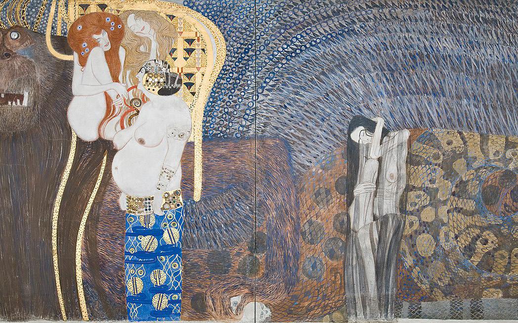 Concebido como un homenaje visual a la Novena Sinfonía de Beethoven, y en diálogo con la escultura de Max Klinger expuesta en la misma muestra, el friso de Klimt se despliega en tres paredes como una alegoría del alma humana en busca de la felicidad.