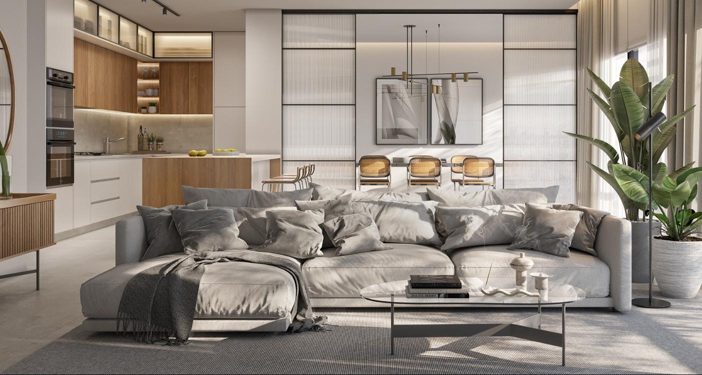 In the dining room, the standout feature is the organically shaped chandelier, serving as the focal point and reinforcing the idea of togetherness around the table, whether with friends or family.