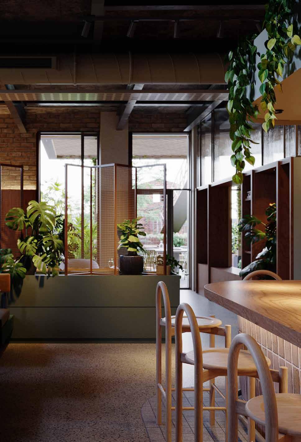 At ground level, a series of welcoming spaces are a backdrop to community life, enticing residents to stop and stay for a while, across different times of day. Combining upscale comforts with a casual yet refined ethos, the Boiler Lounge with a private dining area, lounge and alfresco terrace are conceived as an inclusive sanctuary for unwinding and social connection. Textural timber wall panels, sheer screens and sculpted furnishings become a sophisticated contrast to the restored brickwork and raw concrete ceilings that add character and a sense of place.