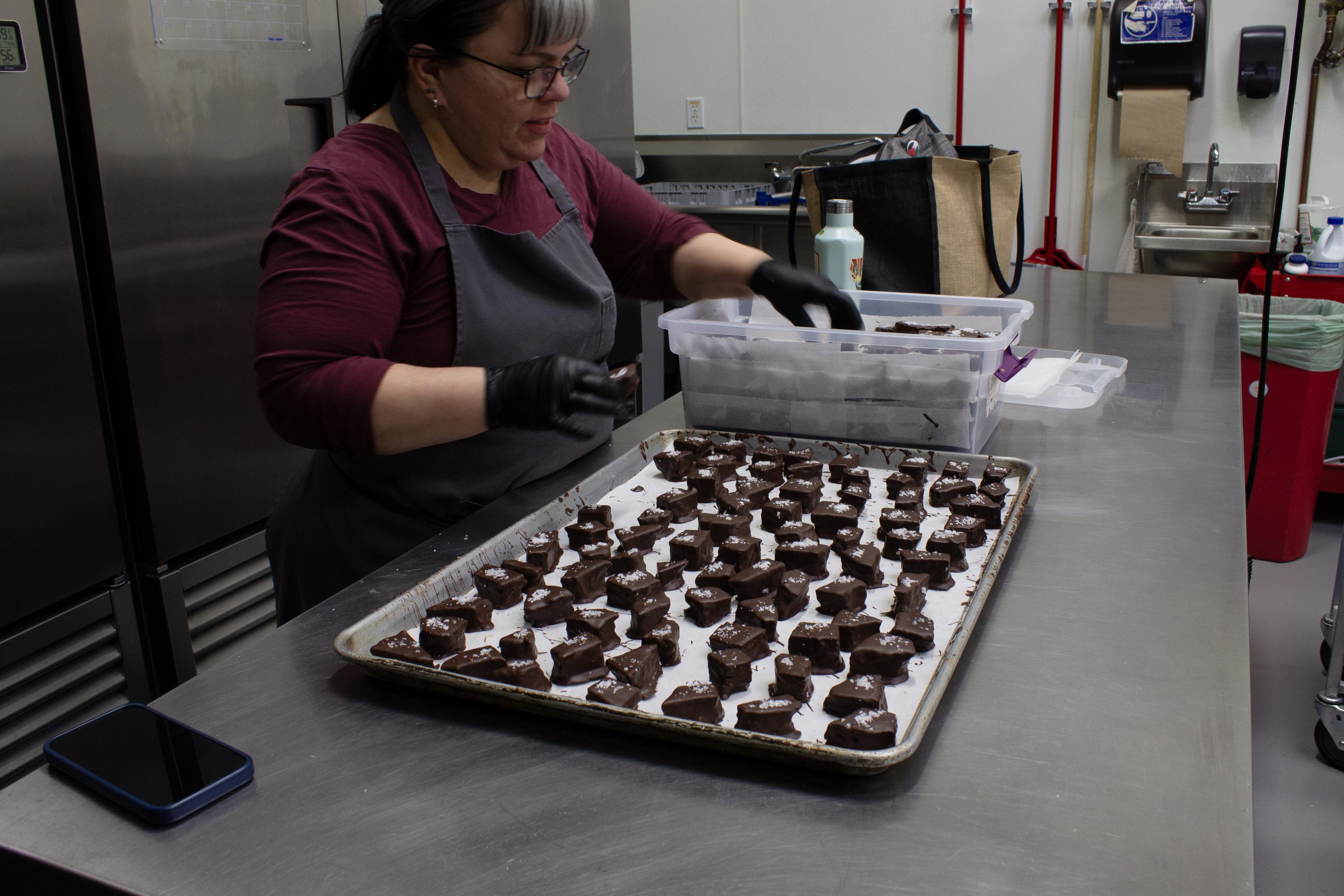 In the kitchen, full of bright lights and the buzzing sound of the refrigerators, Suzanne LaFleur stands behind a stainless steel counter. She is dipping small chunks of a honeycomb into a bowl of warm, melted, dark chocolate.