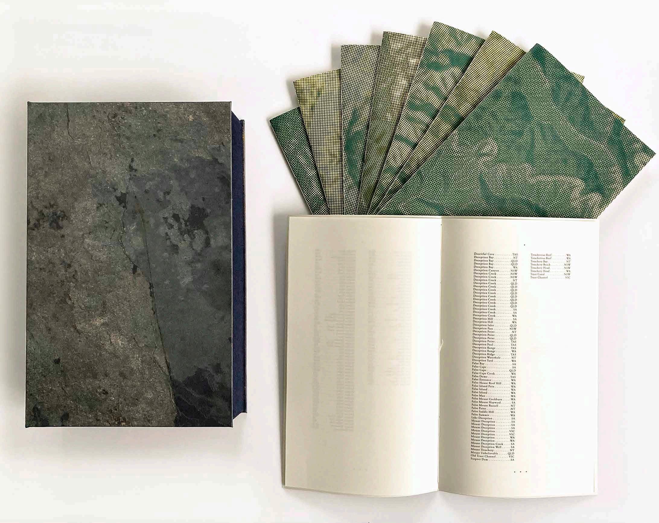 In creating Unsettled, Deidre Brollo collated a litany of thousands of contemporary Australian placenames, each of which has a unique relationship to politics, culture, topography and toponymy. In reading the place names in this book we may reflect on how writing, language and naming have been used as colonial and bureaucratic tools to shape, control and ‘settle’ zones of upheaval in Australia. “By inscribing the map with traces of emotion, bewilderment, violence, subjugation, opportunity and failure, this printed evidence of settlement speaks not just of individual events, but of systemic ways of thinking, being and acting,” says Brollo. The artist aims to disrupt the unreflective manner that many of us use to read maps and find places, reminding us of the “unfinished and restless nature of this country and its history”.