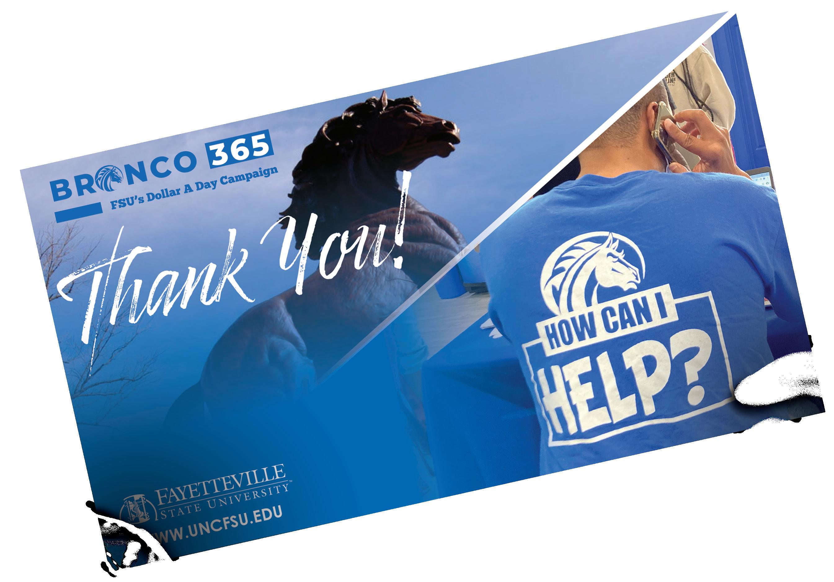 “As you can see, it is an extraordinary time to be a Bronco! Fayetteville State University was founded to make a difference in people’s lives, not just for our students, but also for our families, friends and neighbors in our communities, our city and beyond. Thanks to our founders and all those who helped blaze this trail of opportunity, we’ve come a long way! We’re proud of our accomplishments, but there is still work to do and we need your support. I think of Dr. Clarence E. Lloyd, Jr. 65, FSU’s most generous individual donor. He came from humble beginnings and told me how he started small, giving what he could along the way. Today he’s given over $1 million dollars to support the important work we do.”