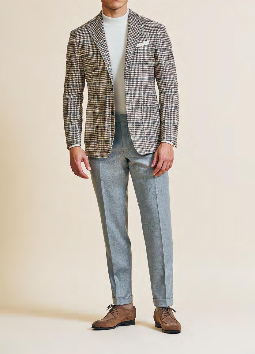 Perfect for both your capsule collection and full customisation are your many styles of knitwear, now made exclusively in our very own knitwear atelier located in Umbria, Italy (p. 24). Just in time for transitional temperatures, this season also brings your new full zip with baseball collar closure (p. 32), full button with shawl collar closure (p. 30) and the new design option of a wide ribbed collar, hem and cuffs (p. 34). Likewise, your festive staples (p. 10) are also highly suited to custom- and ready-made, which you’ll want to order well in advance of the holiday frenzy. And don’t forget that virtually every item can now easily double as a TryOn