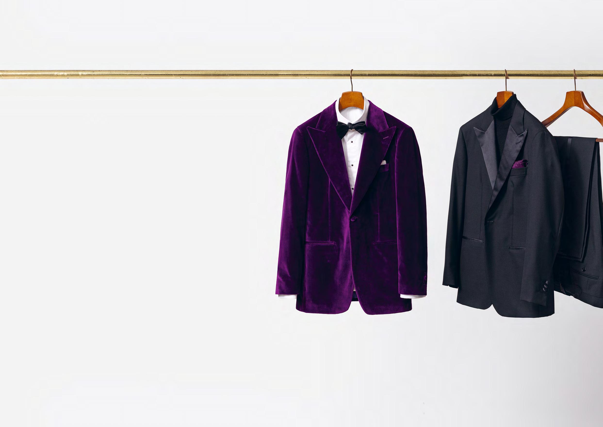 Don't be afraid to reinterpret the classics! As this dinner jacket in purple stretch cotton velvet shows, a slightly daring fabric can make for a sophisticated statement when tailored to obvious perfection. Our advice: keep the rest understated by adding only a white compact cotton poplin tuxedo shirt, black stretch wool twill tuxedo trousers, a black satin bow tie and black velvet plain-toe loafers.