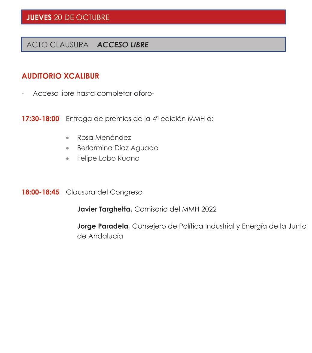 Sin adelantarse a los acontecimien tos, habrá primero que disfrutar de este encuentro en Sevilla, que sin duda será un gran acontecimiento en la minería nacional, europea e inter nacional. MMH 2022 abre sus puertas del 18 al 20 de octubre de 2022 en Fibes, el Palacio de Congresos y Ex posiciones de Sevilla.