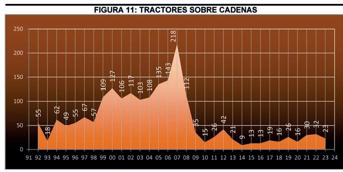 En 2023, los tractores de cadenas han caído hasta las 23 unidades, lo que supone un descenso del -28,12%.
