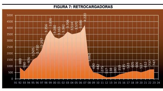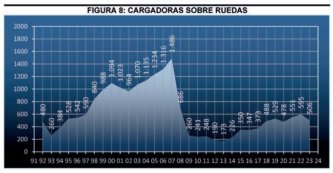 Las cargadoras de ruedas es una de las líneas más estables, que continua su crecimiento desde que en el año 2013 marcó su mínimo histórico con 173 equipos comercializados. En 2019 se vendieron 529 máquinas, en 2020 cayó a 478 cargadoras como consecuencia de la pandemia, en 2021 las ventas ascendieron a 551 máquinas, en 2022 casi alcanza las 600 unidades, habiendo cerrado el