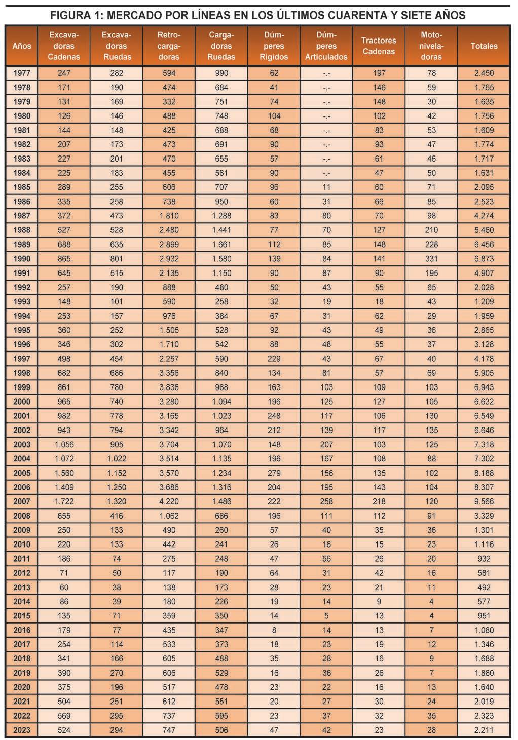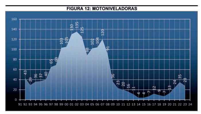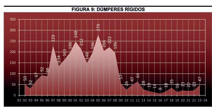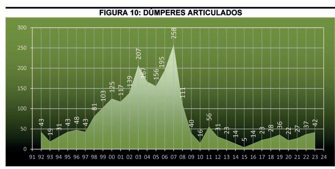 sus dientes de sierra son más habituales. Pese a ello, desde que comenzó la crisis a partir del 2007 no levantan cabeza como consecuencia de la falta de partidas presupuestarias en España para la ejecución de grandes obras de movimiento de tierras. De hecho, y como se puede ver en la Figura 9, las unidades vendidas del 2014 al 2017 no superaron nunca las 20 unidades. En 2018 se entregaron circunstancialmente 35 equipos, algunos de ellos de tamaño medio-grande, de los considerados como equipos mineros, pero en 2019 se vuelven a estabilizar las ventas en torno a las 20 unidades, hasta el pasado 2023, que se ha disparado a las 47 unidades, algo en lo que tiene mucho que ver los proyectos mineros en ejecución en España.
