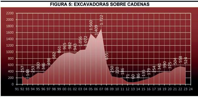 Las excavadoras hidráulicas sobre cadenas son uno de los equipos más significativos en el sector de la maquinaria de movimiento de tierras. Los datos de ventas de 2023 indican que es una de las líneas más destacadas del sector de la maquinaria de producción, con el 23,69%, con una evolución que ha pasado de las 1.722 unidades del año 2007 a las 60 del 2013, lo que supuso una caída del 96,5%, y a las 524 unidades de 2023, habiendo marcado un descenso del -6,09% en 2023 con respecto al ejercicio anterior, en el cual se vendieron 558 unidades.