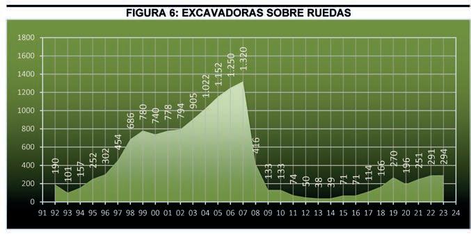 Las excavadoras sobre ruedas son una tipología de equipos que desde el año 2011 al 2016 ha tenido muy poca variación en sus ventas. Sin embargo, el repunte en el sector de la construcción y el incremento en las ventas de las unidades específicas para fines industriales, como es la manipulación de sólidos, chatarras, reciclaje, maderas, puertos, etc., ha generado que en los últimos años el incremento haya sido muy importante, pasando de las 77 unidades del 2016 a las 294 máquinas de 2023.
