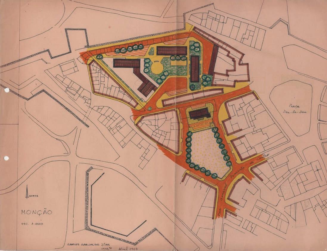 Ainda que a sua ação se estenda por um largo território, Espanha e Macau incluídos, enquanto arquiteto e urbanista, Carlos Carvalho Dias elegeu como campo privilegiado de intervenção a zona norte do país e, em particular, o Minho e Douro Litoral. Monção é um desses exemplos, com registos de uma primeira colaboração que remontam a 1966, ano em que Manuel de Carvalho, então Presidente da Câmara, o convida a assumir o cargo de Arquiteto-Urbanista Consultor, funções que manterá, pelo menos, até ao final da década de 80. Numa breve consulta da documentação doada por Carvalho Dias à Fundação Marques da Silva, ficamos a saber que desde o primeiro momento lhe é pedido um conjunto de trabalhos desenhados no contexto do Plano de Melhoramentos de Monção, entre outros: revisão do anteplano de urbanização, através da realização de estudos parciais e pareceres técnicos; reparação, beneficiação e reintegração de edifícios existentes na Vila; localização do busto do poeta João Verde; escolha do terreno para a Escola Primária, possibilidade de um edifício para a Escola Técnica; organização do Parque de Campismo da Vila; o projeto do novo mercado; o arranjo do espaço livre junto à Muralha da Matriz; a aquisição da Casa de Souto del Rey (imóvel do séc. XVII para o qual Carlos Carvalho Dias vai assinar um anteprojeto de adaptação a Museu e Biblioteca, em 1970, e que apenas mais recentemente, em setembro de 2021, veio a abrir as suas portas ao público enquanto Museu Monção & Memória). Por sua vez, a leitura dos Relatórios apresentados anualmente enquanto Arquiteto-Urbanista Consultor da C.M. de Monção deixa bem percetível o progressivo alargamento do horizonte das atividades desempenhadas, com Carvalho Dias a assinar, em 1983, já com Pedro Guimarães, a autoria do Plano Diretor Municipal, bem como uma sua posterior revisão em 1989.