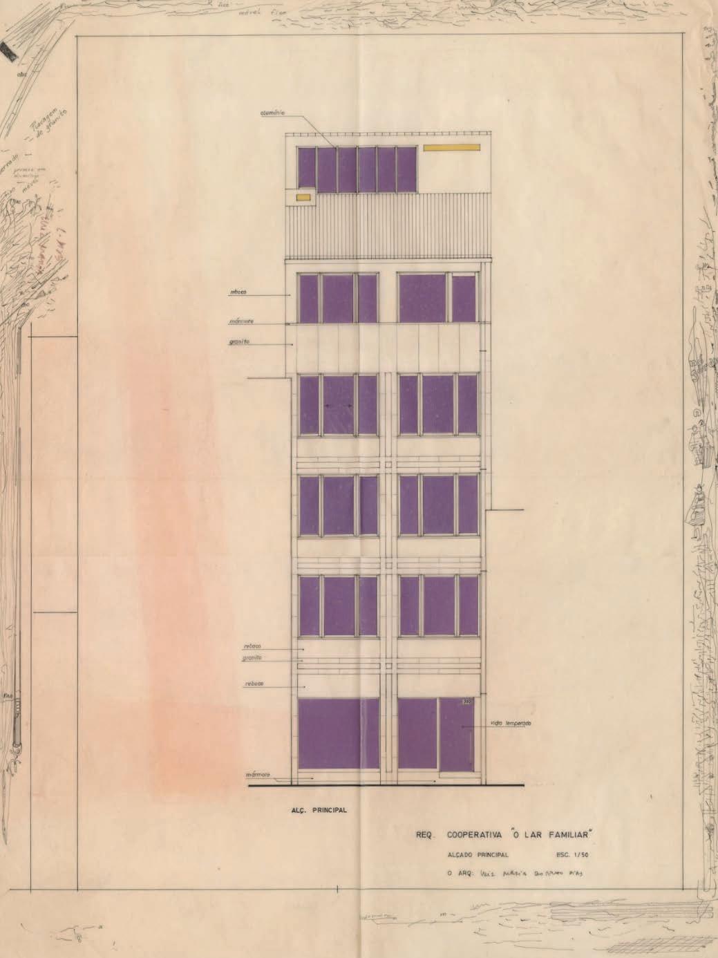 Ainda na década de 80, Luiz Botelho Dias vai projetar edifícios para a Cooperativa “o Lar Familiar”. É a um desses projetos que pertence o desenho que aqui se publica, referente a um prédio vizinho da Fundação Marques da Silva, situado na rua Latino Coelho, n.º 292. Só que o convite é para que o olhar se detenha não apenas no centro do desenho, prolongando-se para as margens que o enquadram e que poderíamos apelidar, numa muito livre apropriação do conceito barthiano, de “margens subversivas”. É que aí, nessas margens, dos traços que denunciam o gesto aparentemente comum e banal de limpeza de um aparo vão nascendo formas e palavras que criam outras imagens e sentidos, que nos indicam um pensamento ou estado de espírito. Sentidos que continuarão por decifrar quanto à intenção de quem os registou, mas que transportam uma outra dimensão para o desenho. Terá sido verdadeiramente desfeito esse “nó górdio” pelo “Luiz Maria” que tão cuidadosamente desenha a fachada e sublinha os materiais a utilizar na construção do prédio?