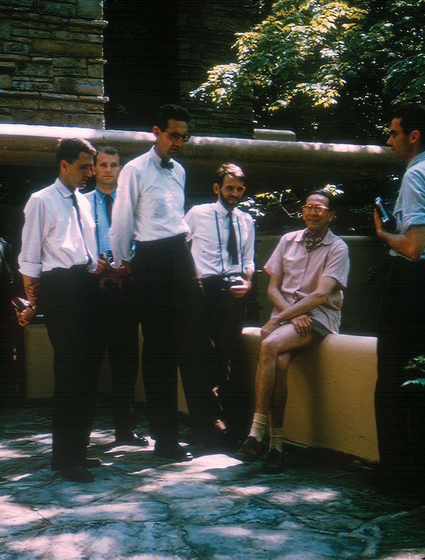 Desconhecemos a identidade da quase totalidade dos participantes neste encontro, incluindo a de quem tirou a fotografia, mas facilmente nela se reconhece Hestnes Ferreira, o quarto a contar da esquerda, com a sua Canonflex RP à tiracolo, e o próprio Edgar Kaufmann Jr., descontraidamente sentado. E com este dado talvez se torne óbvia a identificação do lugar – a Casa da Cascata – e o porquê de ser este o anfitrião. Este arquiteto e professor de Arte e História da Arquitetura da Universidade de Columbia, que tinha também trabalhado no MoMA entre 1941 e 1955, era o filho de Edgar J. Kaufmann e Liliane S. Kaufmann, o casal para quem Frank Lloyd Wright projetara Fallingwater. Refira-se, aliás, que terá sido Edgar Junior, enquanto bolseiro da Taliesin Fellowship, a apresentar, em 1933, Wrigh ao seu pai. Mas o ano da visita que a fotografia regista, também acaba por ser simbólico, já que será aquele em que Edgar Kaufmann Jr., que desde 1955 se tornara proprietário da casa por morte dos pais, toma a decisão de a doar ao Western Pennsylvania Conservancy (WPC), como forma de garantir a sua proteção, conservação e acessibilidade ao público, assumindo pessoalmente a condução de muitas das visitas que desde então foram sendo organizadas.