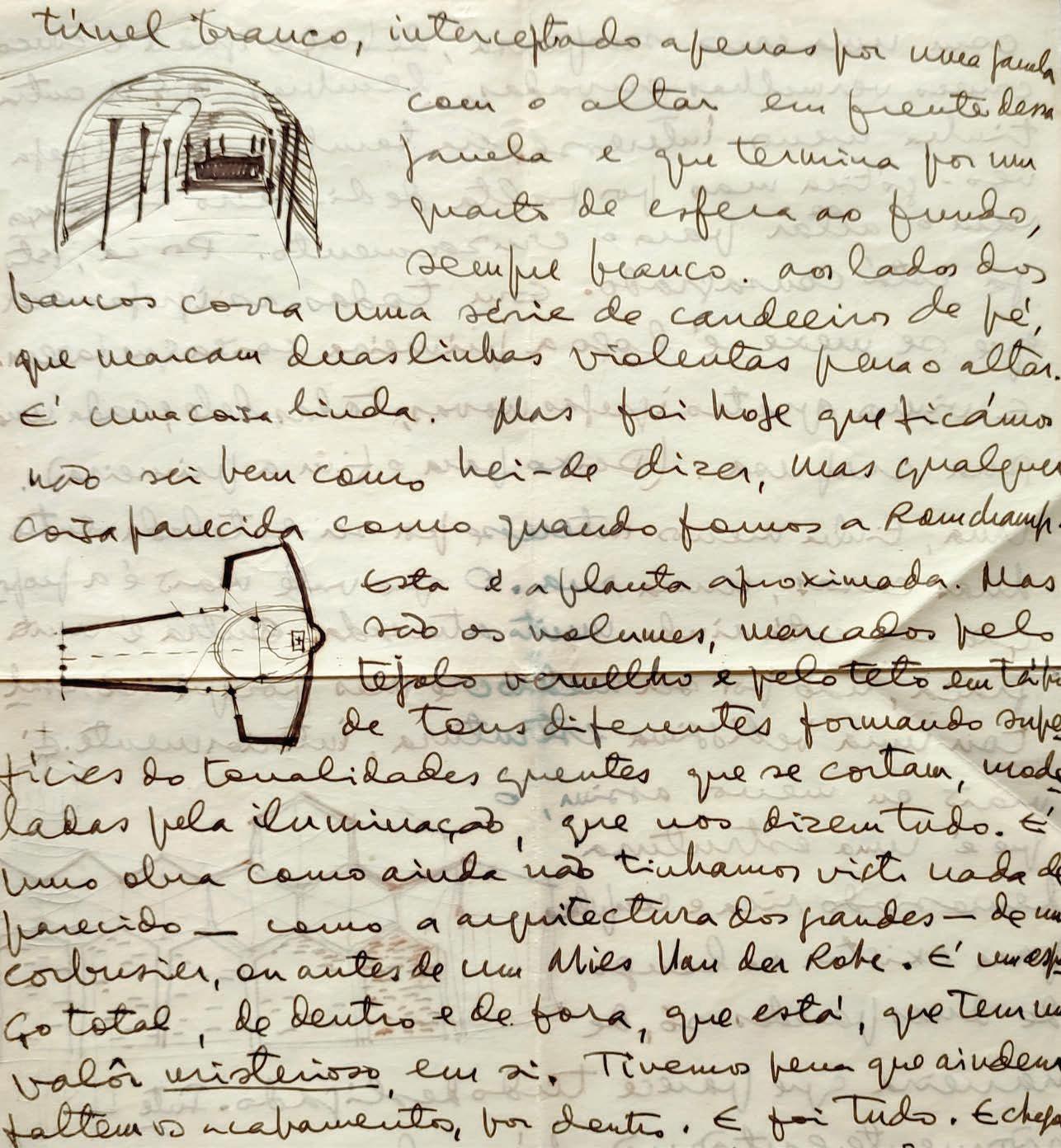 Transcreva-se, a título de exemplo, a forma como analisa e descreve a René, duas obras de Schwartz e que a imagem anexa, para dar a ver os esquissos, também documenta: “Uma pequenina capela [Kapelle Kalk, em Colónia] construída com pedra velha, que é formidável. É um túnel branco apenas interceptado por uma janela com o altar em frente dessa janela e que termina por um quarto de esfera ao fundo, sempre branco. Ao lado dos bancos corre uma série de candeeiros de pé, que marcam duas linhas violentas para o altar. É uma coisa linda. Mas foi hoje que ficámos não sei bem como hei-de dizer, mas qualquer coisa como quando fomos a Ronchamp. Esta é a planta aproximada [St. Maria Königin, em Frechen]. Mas são os volumes, marcados pelo tijolo vermelho e pelo tecto em tábuas de tons diferentes formando superfícies de tonalidades quentes que se cortam, modeladas pela iluminação, que nos dizem tudo. É uma obra como ainda não tínhamos visto nada de parecido –como a arquitectura dos grandes – de um Corbusier, ou antes de um Mies Van der Roe. É um espaço total, de dentro e de fora, que está, que tem um valor misterioso em si. Tivemos pena que ainda faltem os acabamentos, por dentro.”