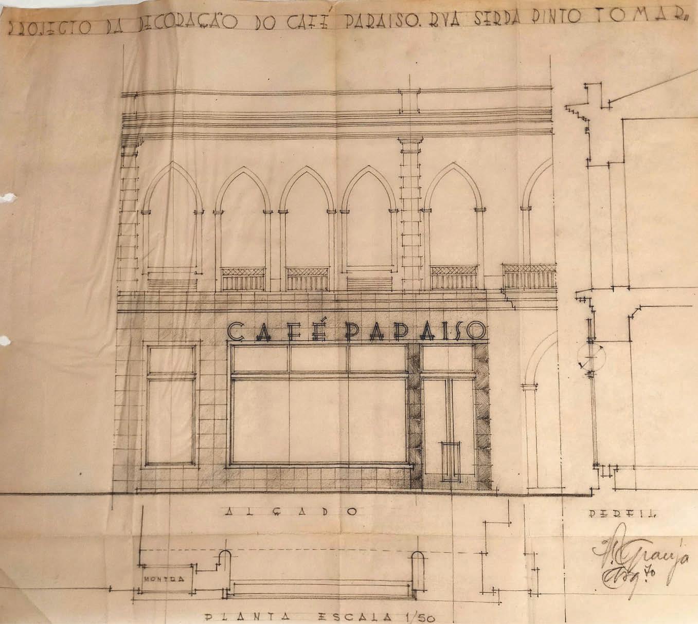 Durante esses mesmo anos, mas a título individual – sendo que a presença na cidade pode ter ditado, num ou noutro sentido – nova encomenda, Francisco Granja recebe e aceita o desafio de “modernizar” o Café Paraíso, situado na Rua Serpa Pinto, nessa altura, já propriedade de Manuel Joaquim Mota Grego, em cuja família ainda hoje se mantém. Assim, em 1943, Francisco Granja começa a projetar aquela que seria uma “remodelação simples, dentro do espírito moderno, havendo por necessidade económica, aproveitar a sua estrutura geral, e dentro dela tirar o maior partido decorativo, conforto e bem-estar, tam desejados”. Mantiveram-se as mesmas colunas, que ainda hoje são marca distintiva do seu espaço interior, mas com um aspeto novo e diferente, resultante da “aplicação de um material moderno fingindo mármore”. Terá sido então que se procedeu à aquisição das cadeiras Bauhaus, vindas expressamente da Alemanha? Da consulta da documentação em arquivo, confirma-se sim a profunda intervenção ao nível das infraestruturas do espaço, o cuidado colocado na renovação do sistema de iluminação elétrica, a redistribuição do mobiliário (das mesas aos bilhares) bem como a construção de um balcão, em andiroba, que chegou aos nossos dias. E também a morosidade das obras, seja por contenção financeira, seja devido à dificuldade em obter materiais. Por exemplo, numa carta do construtor civil, de julho de 1946, ficamos a saber que a obra se encontrava paralisada devido à falta de ferragens, vidros das montras e espelhos. Os materiais chegaram e ainda nesse ano terá sido festejada a reabertura do Café, mesmo que só em 1948 o arquiteto tenha dado por encerrado este processo de obra.