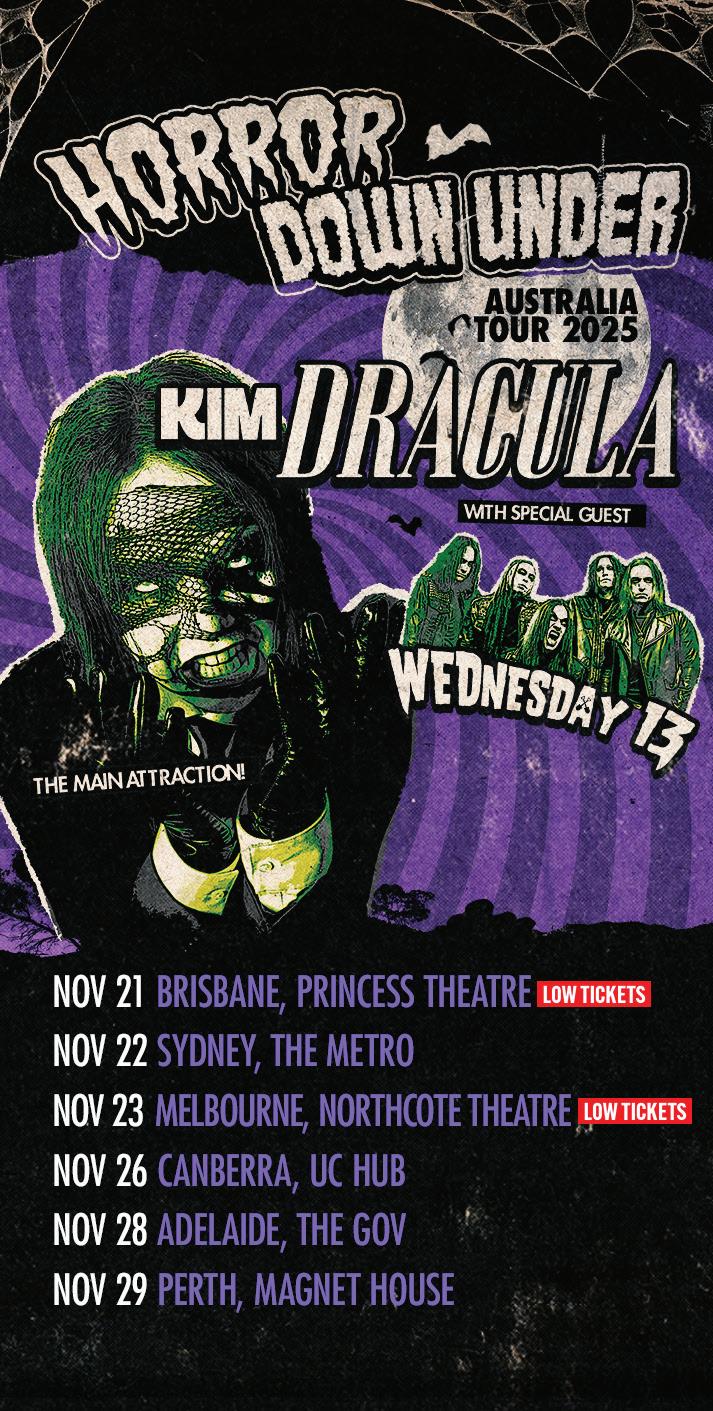 Joining KD for this most triumphant homecoming is the absolute legend, Wednesday 13 who returns on the back of a sold out Australian tour in 2023 celebrating his former band Murderdolls.