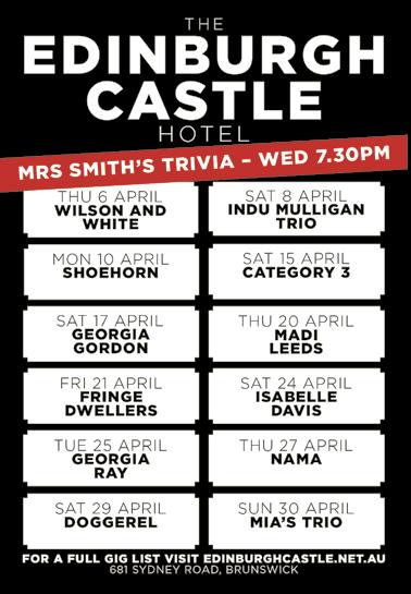 NAMA. Edinburgh Castle Hotel. Brunswick. 6pm. Free. THE LAST WILL & TESTAMENT OF THE COWARD AUSSIE ROB