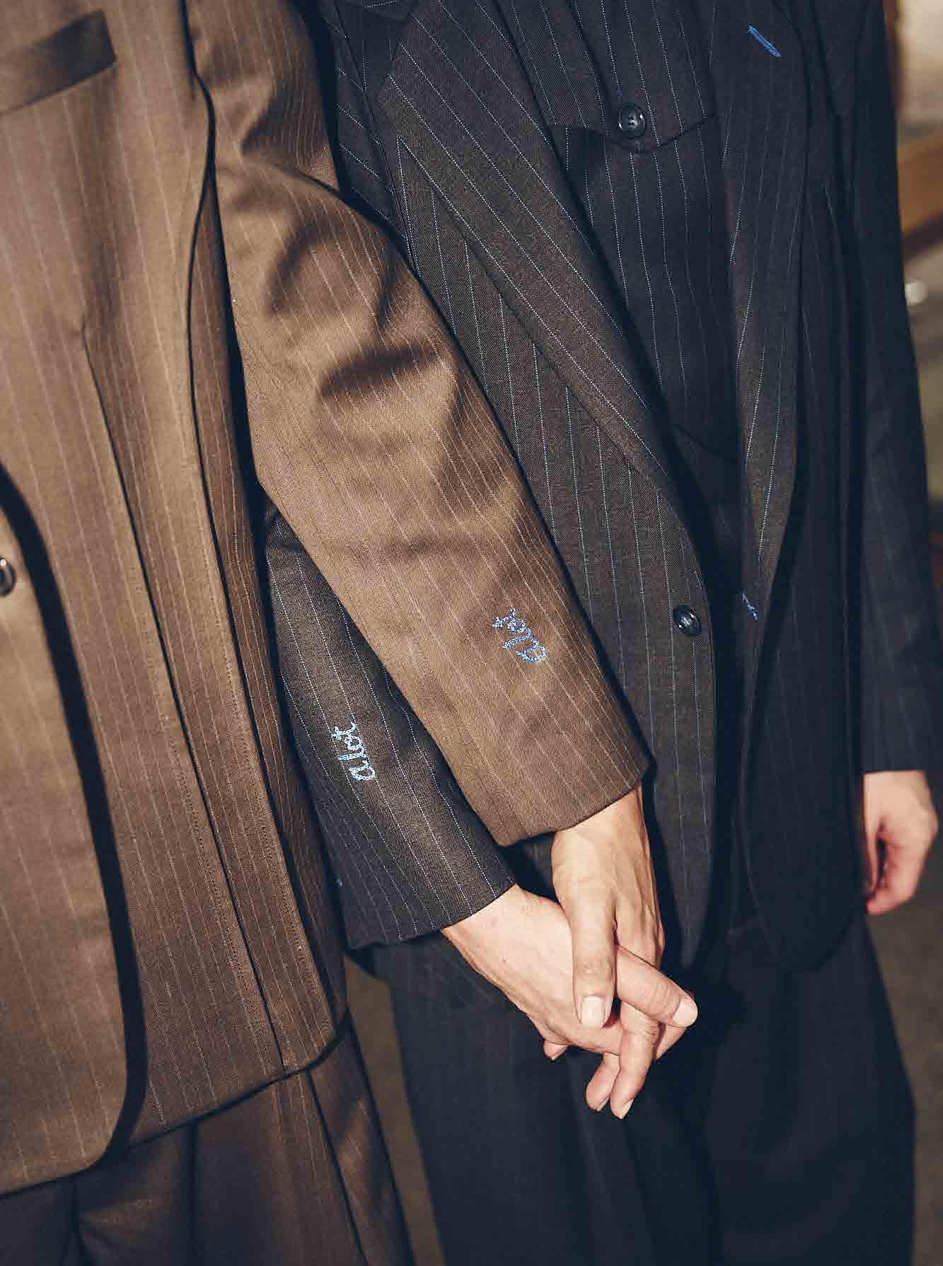 Both looks featured visible French seams along the outside of the jackets, rather than being hidden within the lining. “They were designed to flow through Christopher’s blazer and end at Keith’s, giving them their own unique looks that still came together as one.”