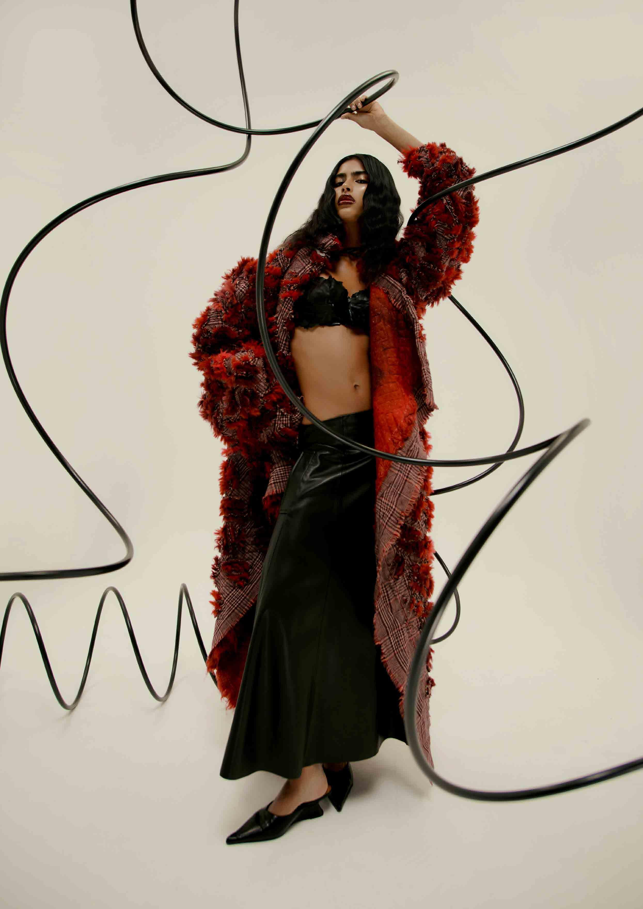 THIS PAGE KARLAIDLAW top and skirt, unbranded skirt from SWOP (worn underneath), WESTERN AFFAIR shoes, stylist’s own socks and earrings OPPOSITE PAGE KARLAIDLAW bra and coat, CAMELIA FARHOODI x NA-KD shoes, stylist’s own skirt