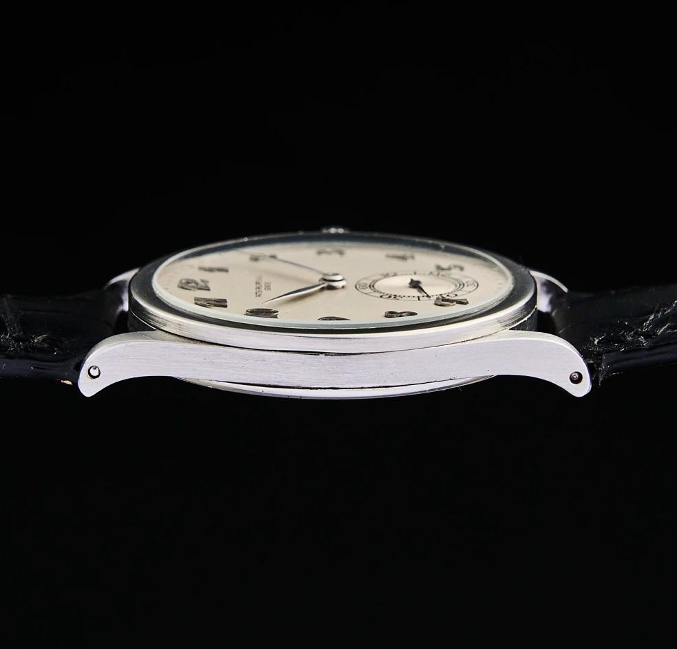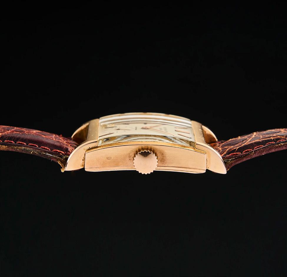 Art Deco dress-watch, ‘Hudson’-style case, chiselled bezels, silver dial, ‘Breguet’ Arabic numerals, made for the Brazilian market, retailed by Relojoaria Gondolo.