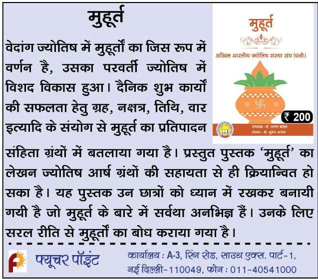 T;ksfr"k esa :fp j[kus okys gj O;fDr ds fy, eqgwrZ ij bl iqLrd esa nh xbZ tkudkfj;ka leku :i ls ykHknk;h ,oa egÙowi.kZ gSaA fof'k"V fØ;k&dyki ds fufeRr eqgwrZ i{k dh vuns[kh dk;Z&fo'ks"k esa vlQyrk nsrh gS] blfy, bldk Kku o è;ku j[kdj lHkh ykHkkfUor gh ugha gks ldrs gSa cfYd loksZÙke le; ij fo'ks"k dk;Z vkfn 'kq: dj thou Hkj lQyrk] ;'k vkfn izkIr dj ldrs gSaA 'kqHk eqgwrZ dqaMyh esa vlQyrk ds ;ksxksa dks jí djrs gq, lQyrk iznku djrk gSA vaxzsth ,oa fganh nksuksa Hkk"kkvksa esa izdkf'kr bl iqLrd dh Hkk"kk vfr ljy] Li"V ,oa cksèkxE; gSA r