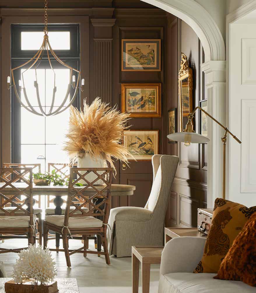 Shown: Isaac Long Cabinet, Perry Table Lamp, Granville Chandelier, Adams Rectangular Dining Table, Royal Arm Chair, Horace Table Lamp, Orson Bench, Edison Cabinet, Darley Coffee Table, Wilbur Coffee Table, Jordan Sofa, Belle Mirror, Fulbright Pendant, Gabby Indoor Pillows