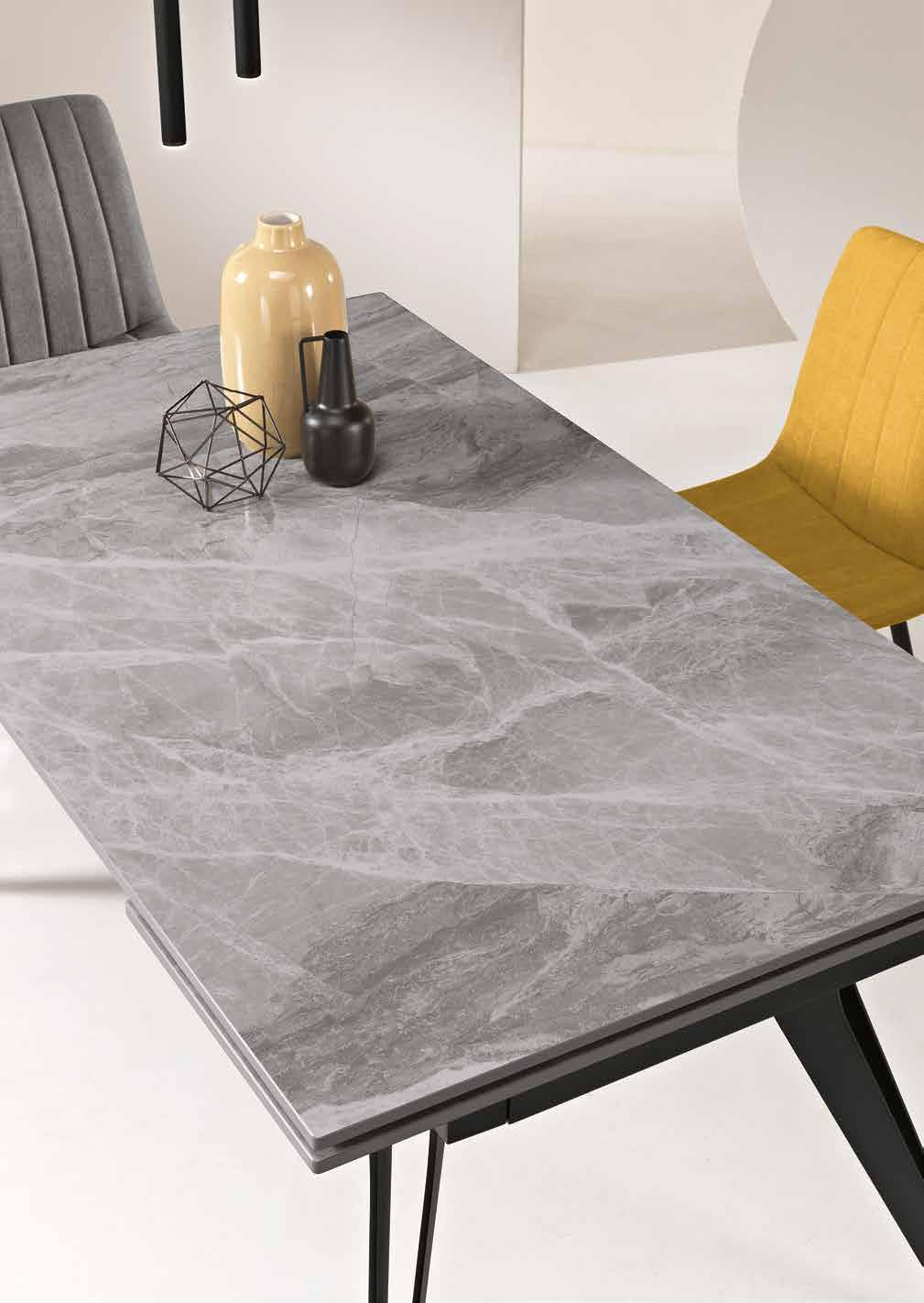 Tavolo allungabile con due allunghe da 40 cm; base in metallo verniciato e piano in pietra sinterizzata effetto marmo.