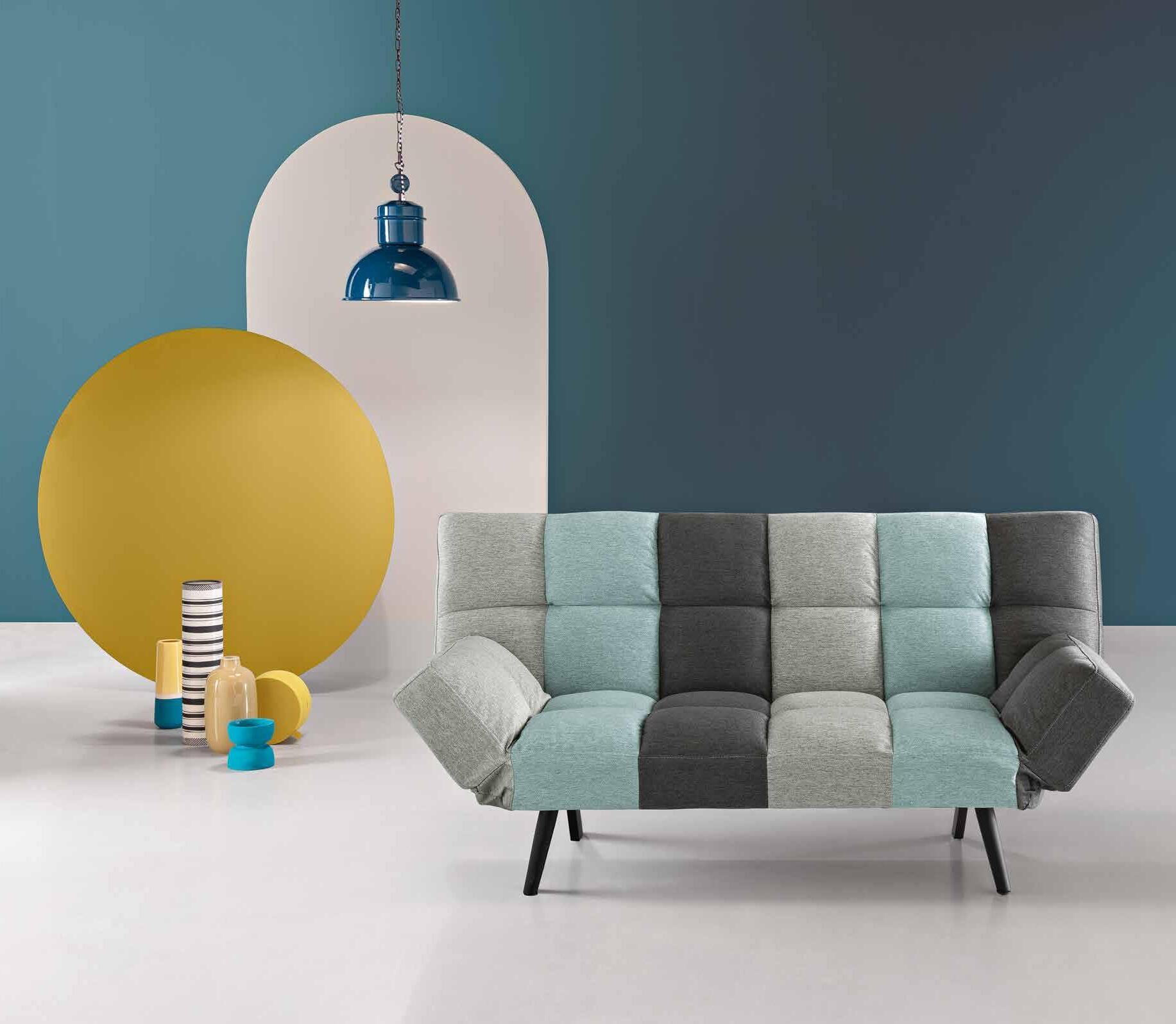 Divano trasformabile in tessuto, braccioli e schienale regolabili.