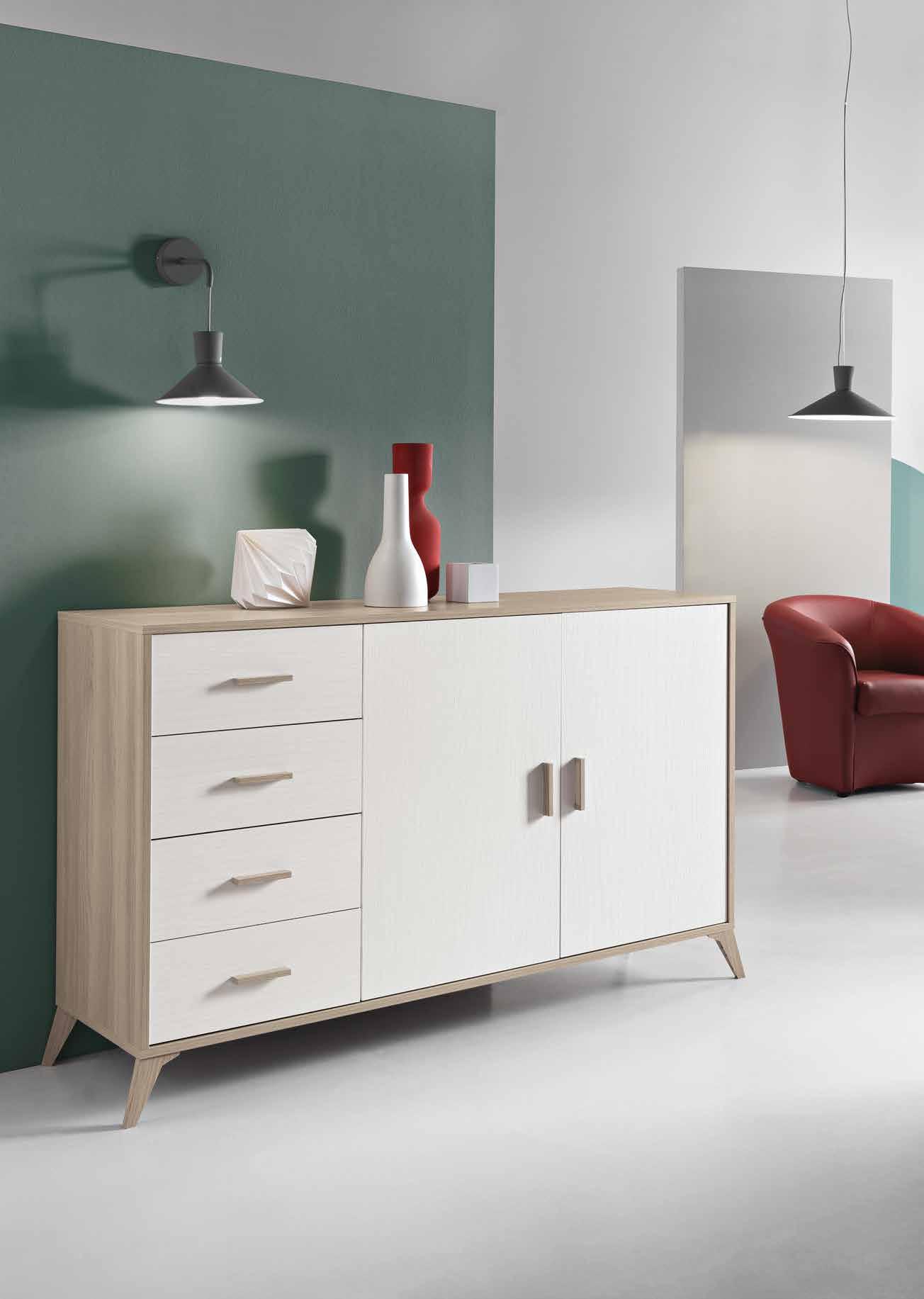 Melamine sideboard with two doors and four central drawers. ABS feet. Available in different colours.