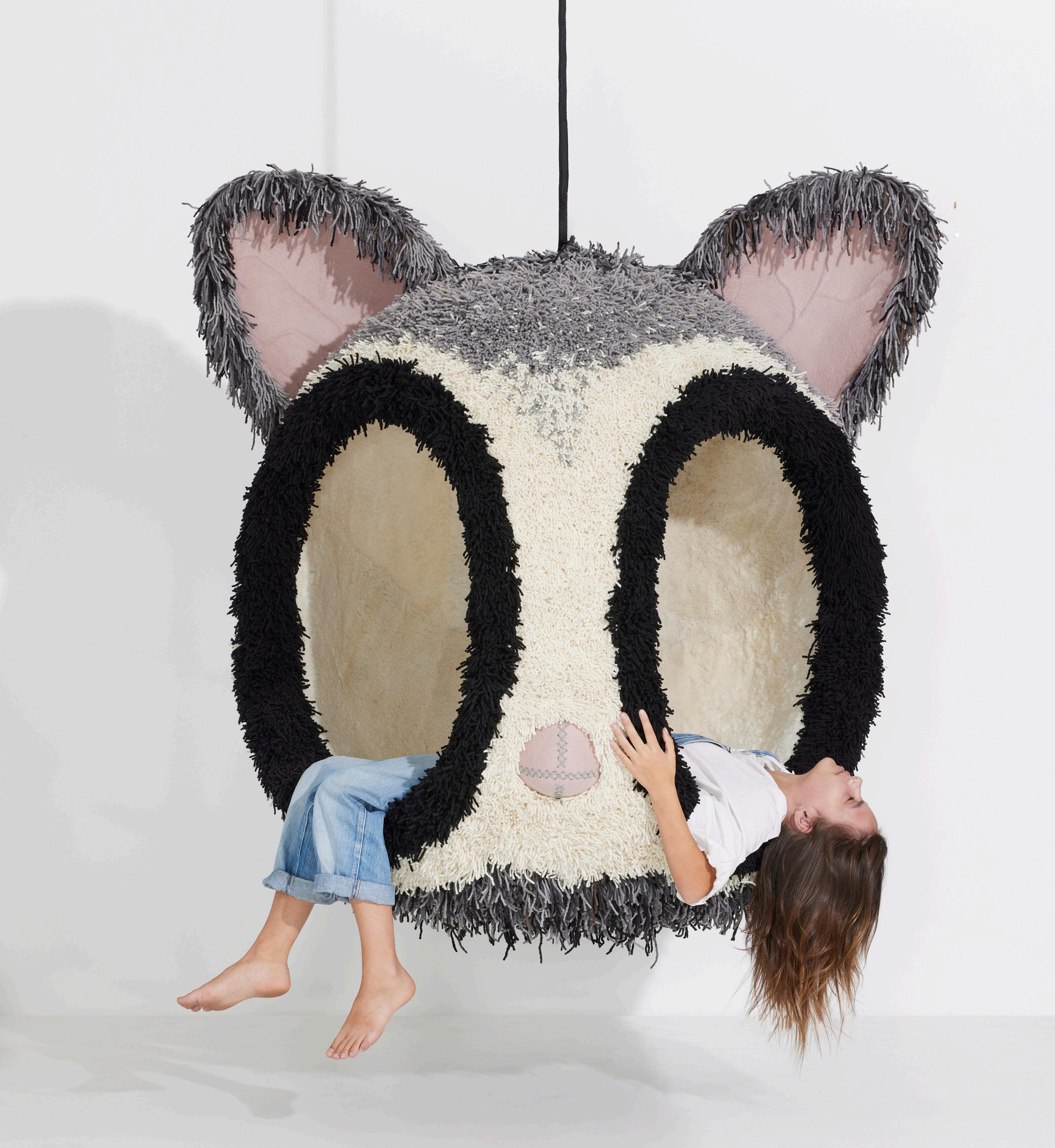 The large standing form of Robert Nesta is covered entirely in hand-felted wool, from the flat expanses upholstered over its body to its carefully curved horns and hairy mane. Climbing through the circular portals, the sitter finds comfort and seclusion inside the animal’s sheepskin-lined form, with porthole-like openings for visabilityor tiny bodies to wriggle through. The gnu (as it is known in North America) is named after reggae pioneer Bob Marley (full name Robert Nesta Marley)—Hefer’s “all-time favourite muscician and life influence.” In South Africa, the animal is known as a wildebeest (meaning “wild beast” in Dutch) and is a common sight in game reserves. The annual migration of more than 1.5 million wildebeest in Tanzania’s Serengeti is regarded one of the “SevenWonders of the Natural World.”