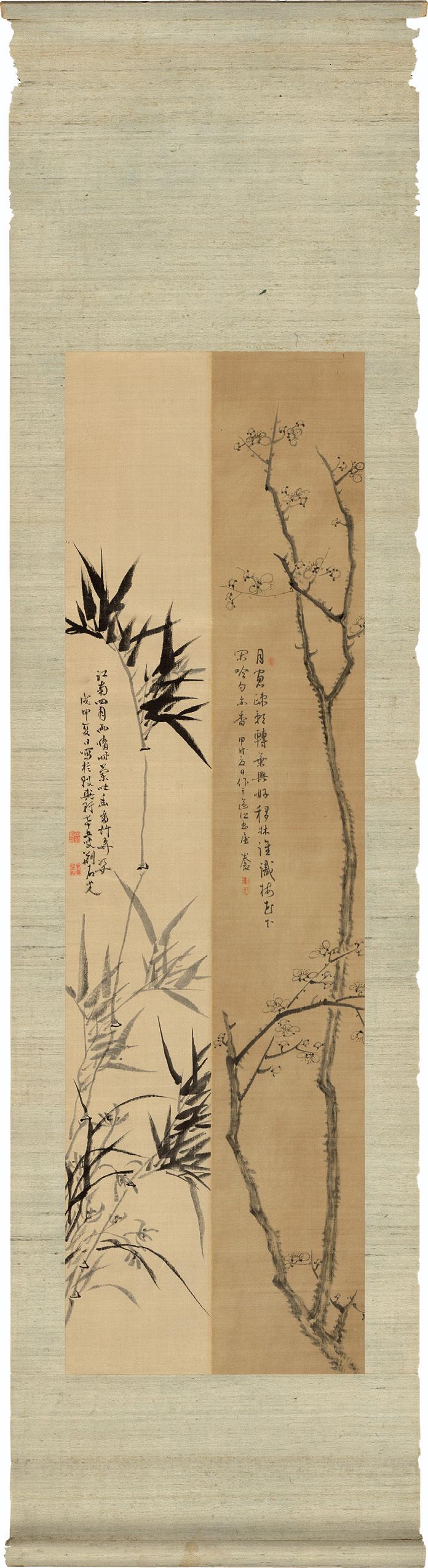 Szene mit dem Raub einer Edeldame durch einen Barbarenkämpfer: Ein schwarzes, ein weißes Pferd in bizarrer Berglandschaft, die sich bis zum verblauenden Wolkenpass - dem extremen Hochformat entsprechend - nach oben staffeln. Zugeschrieben werden kann das Motiv an den chinesischen Maler Zhao Yong (1289-1363), von dem es ein Künstler wohl des 19. Jahrhunderts auf Seide kopierte. – Vollständig aufgezogen, altersbedingt teils stärker gebräunt, nur vereinzelt leicht feuchtrandig (vornehmlich unten im Rahmen), kaum fleckig, nur unwesentlicher Berieb, Gebrauchsspuren, aber sehr dekorativ. Versand nur ohne den Glasrahmen.